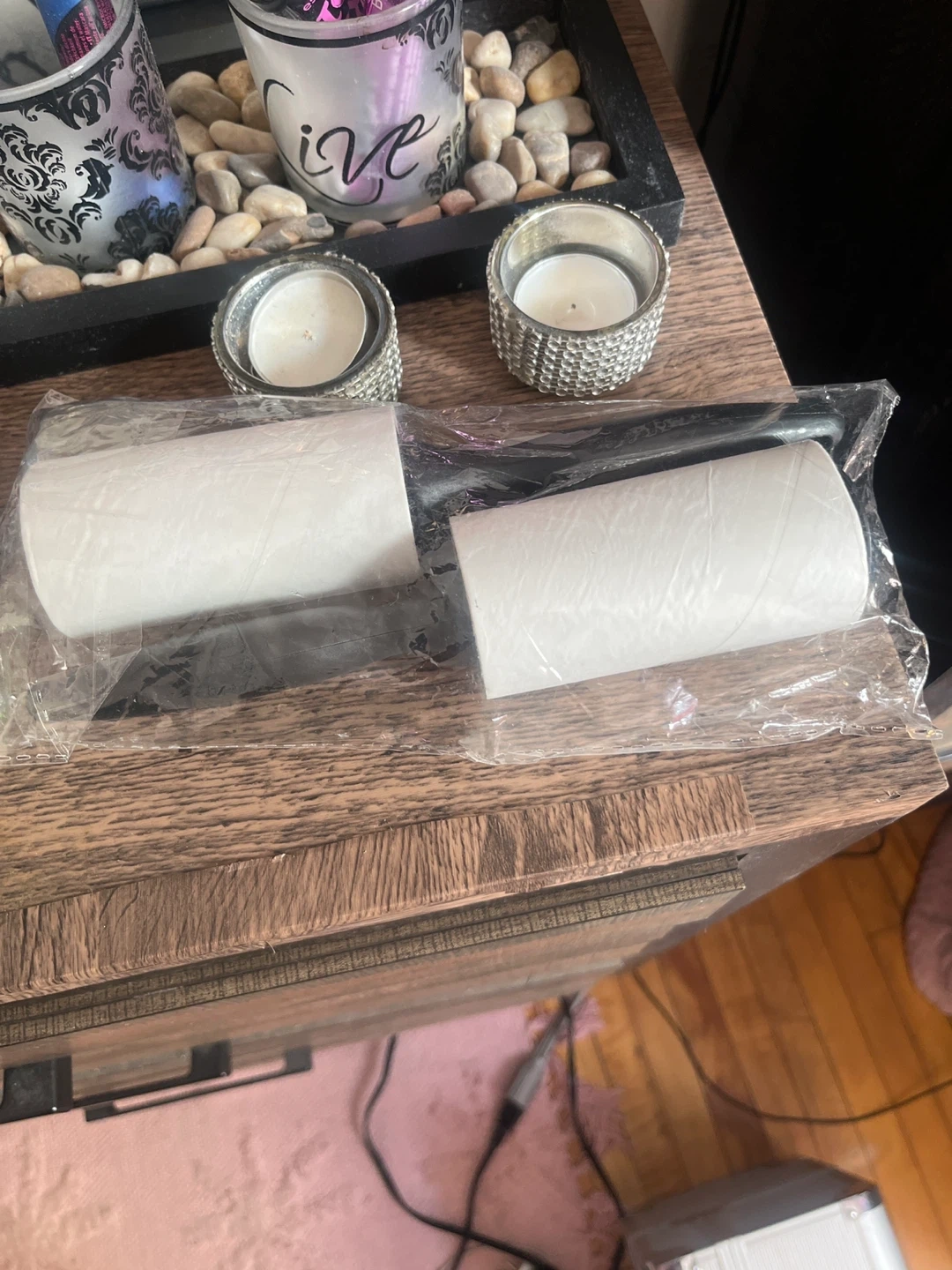 Two white lint roller refills, still in plastic packaging. These are standard-sized refills for most lint rollers. They're perfect for quickly cleaning up pet hair and lint from clothing and furniture. One full roller, and one replacement roll.