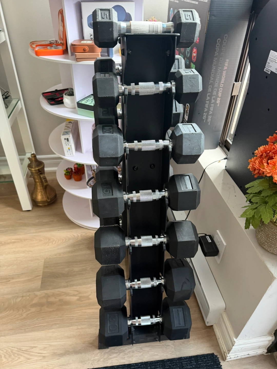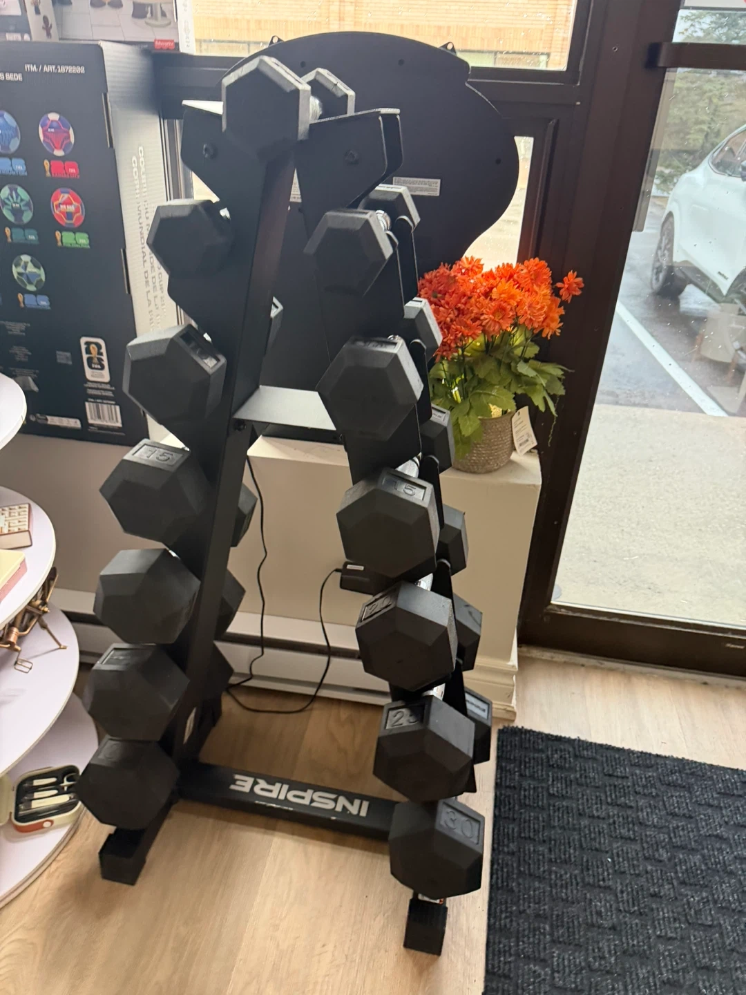 Inspire dumbbell rack holding multiple pairs of hex dumbbells. Hexagonal dumbbell heads prevent rolling. Dumbbells range from 5 lbs to 30 lbs. Sturdy rack for convenient storage.