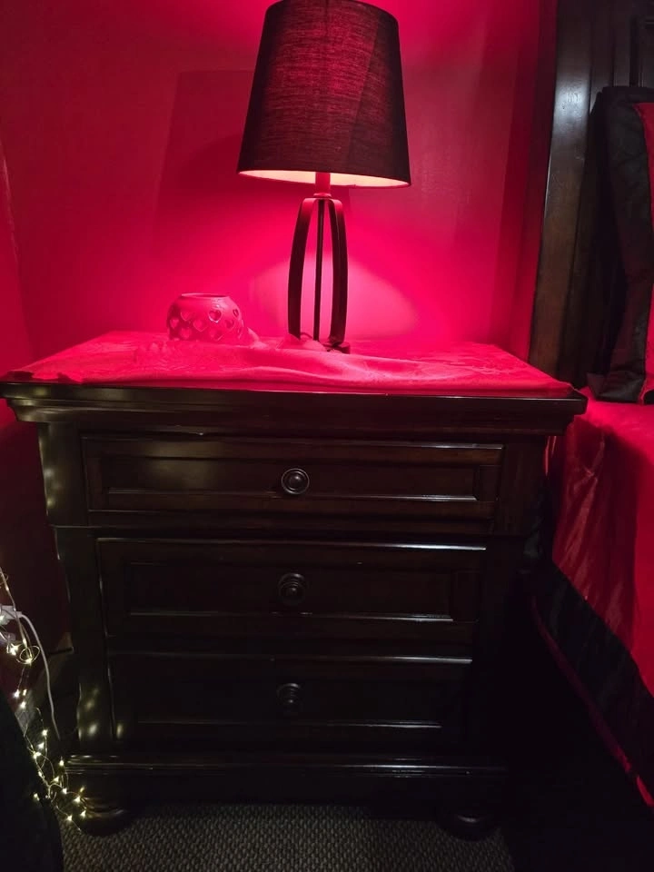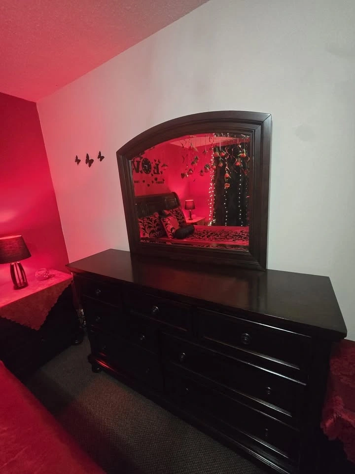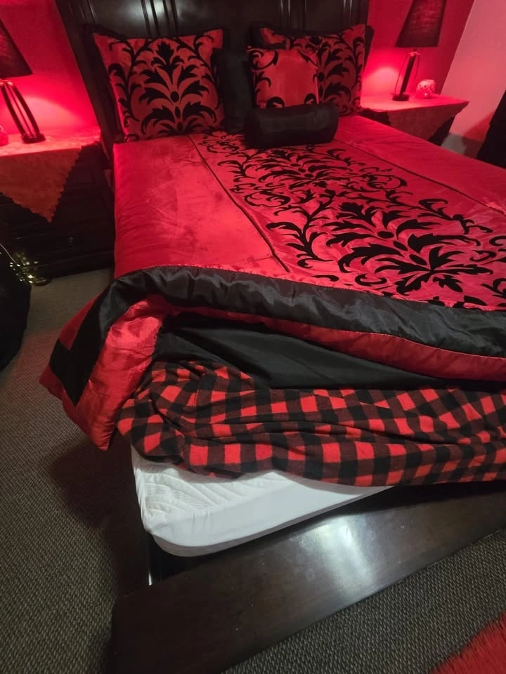 Full bedroom set, everything you see is included. It's real wood with no major damages, just minor small scratches. I'm moving out of the country, which is why I'm selling. It's been used lightly and includes two nightstands with hidden drawers. The large dresser has 7 drawers and a mirror. The queen-sized bed has a new mattress and two drawers on the bottom. Originally purchased for $3,750 with the mattress. Two lamps, blankets, and covers are included free with a red mat. Located near 108 Ave and 144 St.