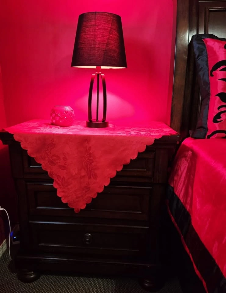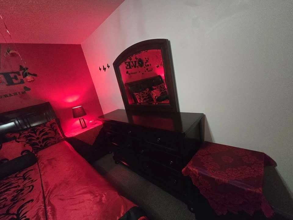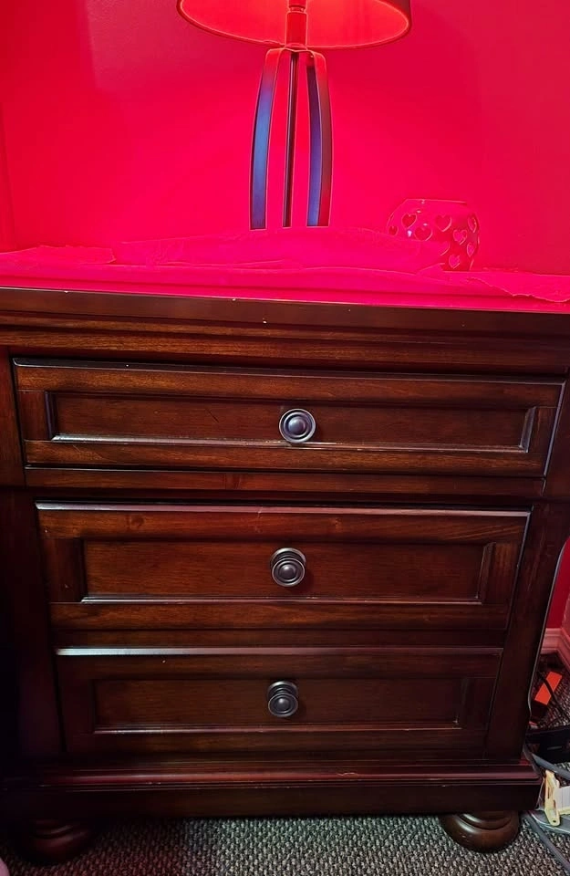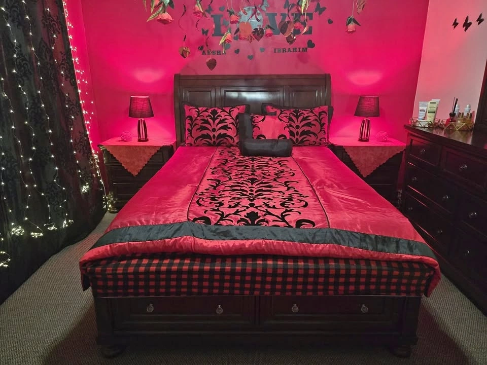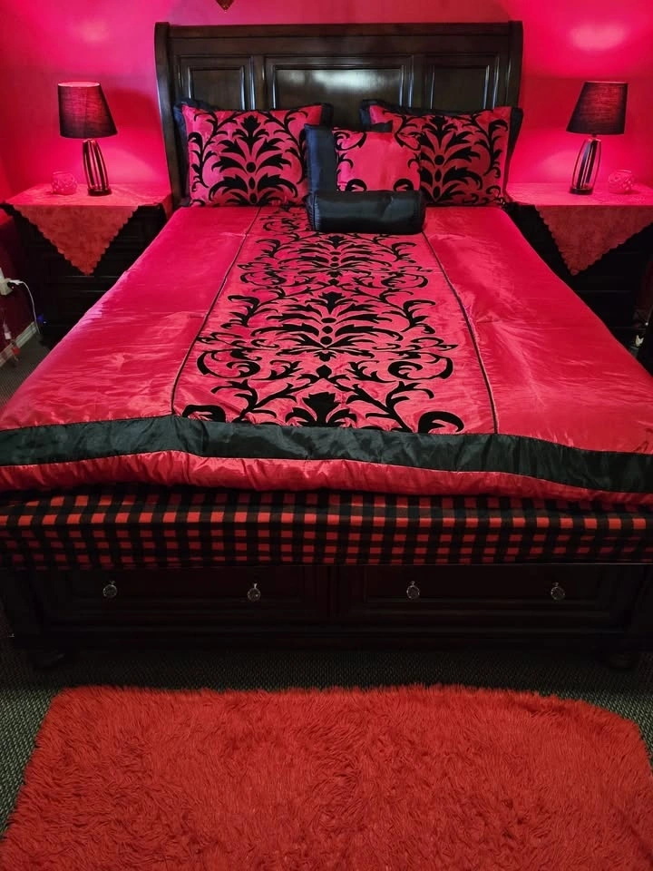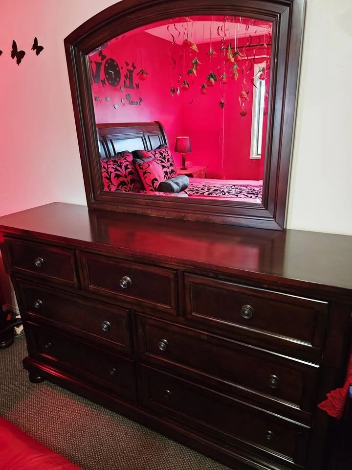 Full bedroom set, everything you see is included. It's real wood with no major damages, just minor small scratches. I'm moving out of the country, which is why I'm selling. It's been used lightly and includes two nightstands with hidden drawers. The large dresser has 7 drawers and a mirror. The queen-sized bed has a new mattress and two drawers on the bottom. Originally purchased for $3,750 with the mattress. Two lamps, blankets, and covers are included free with a red mat. Located near 108 Ave and 144 St.