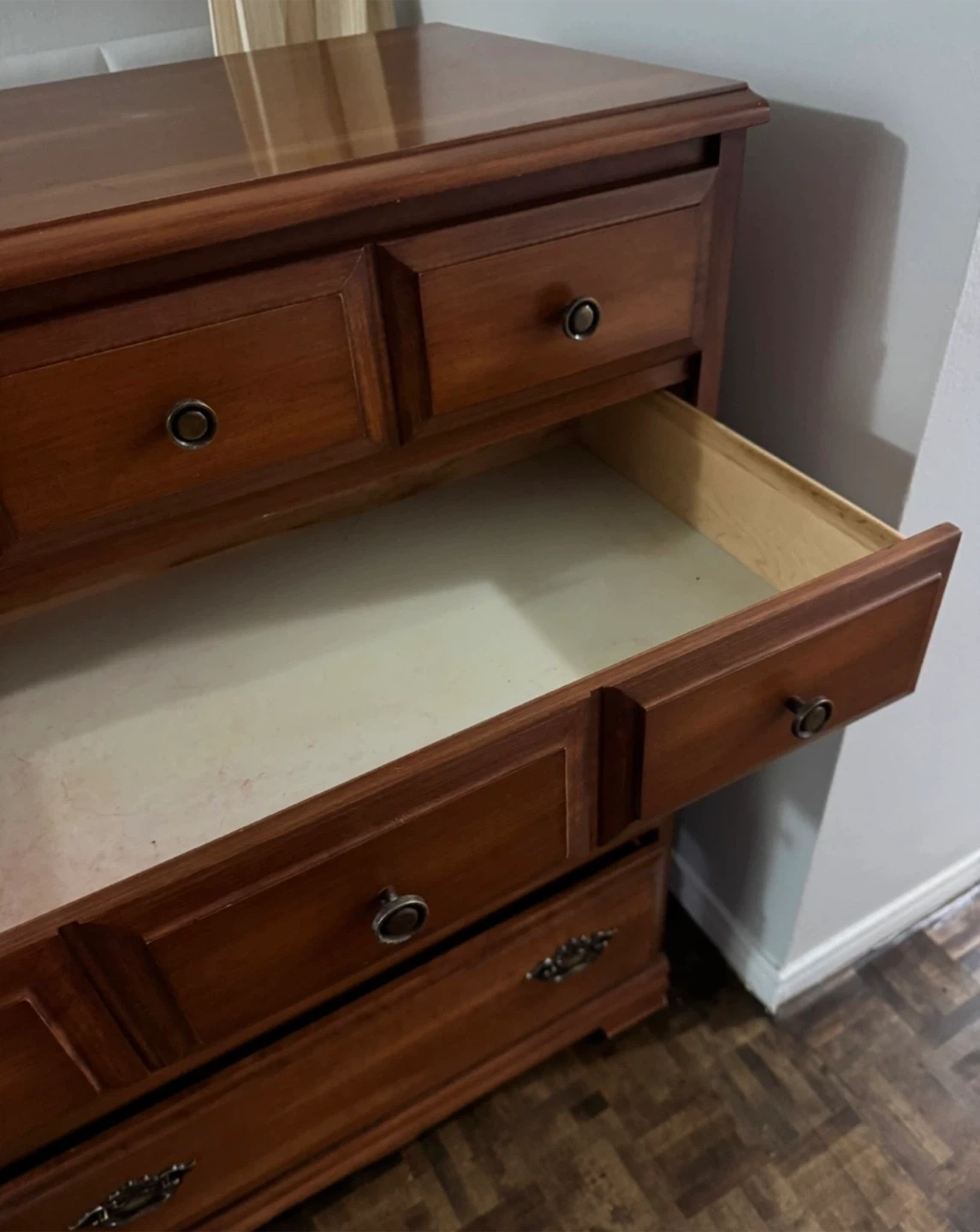 Here's a lovely wooden dresser with lots of drawers for storage! It's in good condition and ready to organize your clothes or other items. The dresser has a classic design with dark metal handles. Perfect for a bedroom or any room needing extra storage