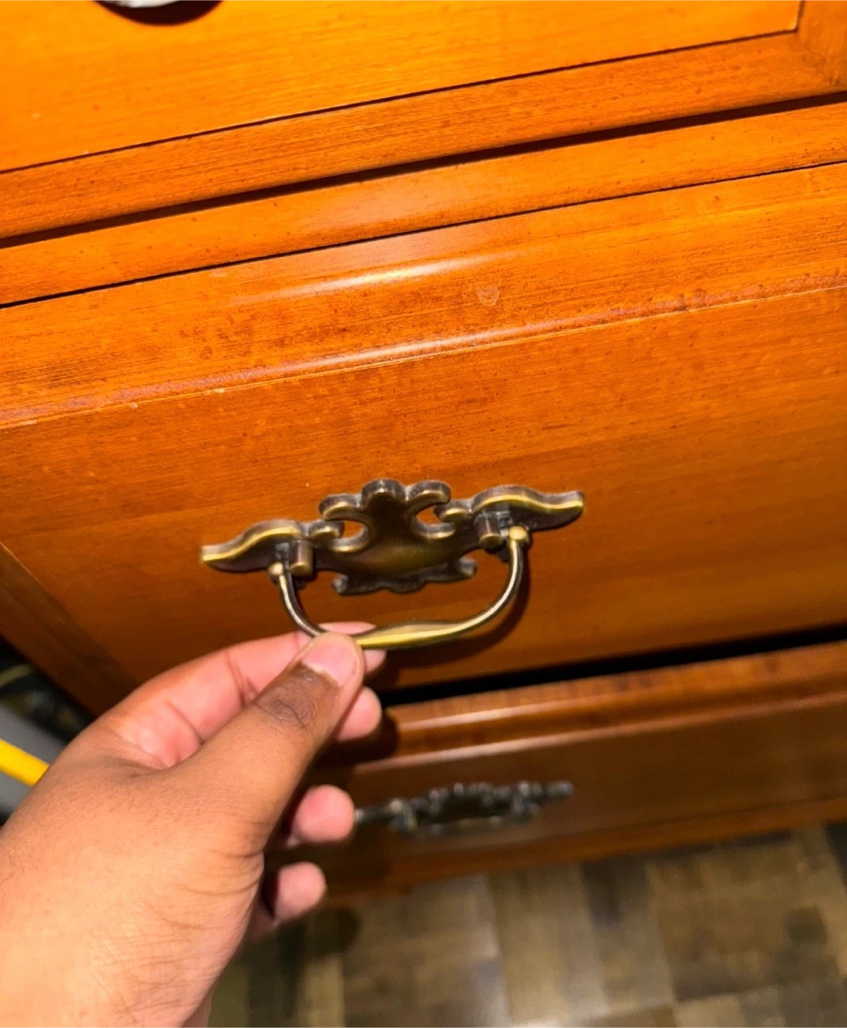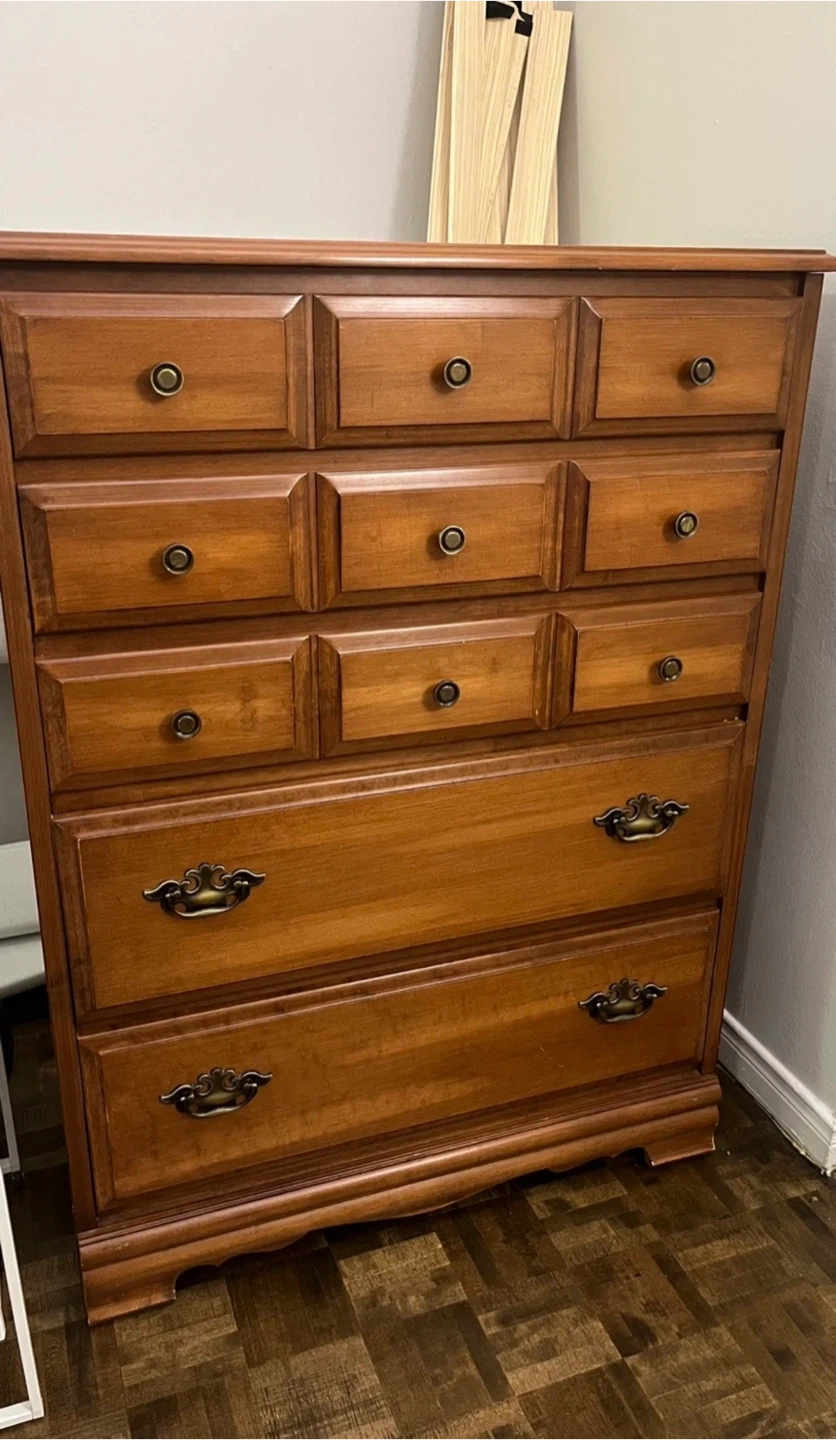 Here's a lovely wooden dresser with lots of drawers for storage! It's in good condition and ready to organize your clothes or other items. The dresser has a classic design with dark metal handles. Perfect for a bedroom or any room needing extra storage
