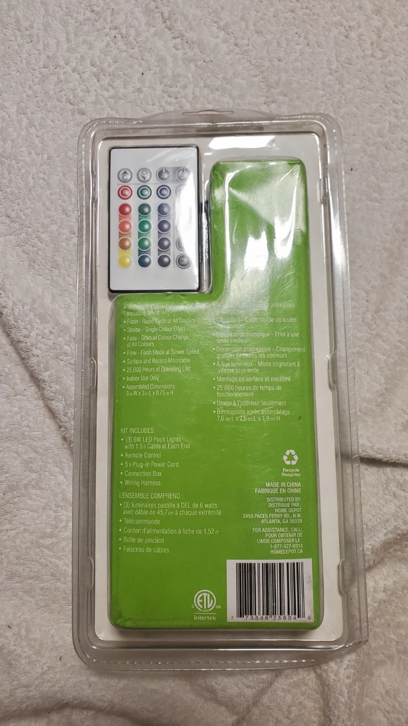 This kit includes 3 LED puck lights with a remote control. They offer 16 preset colours and adjustable colour effects. The lights have a 25,000-hour operating life and come with a 1.52m power cord. Includes connection box and cable ties.