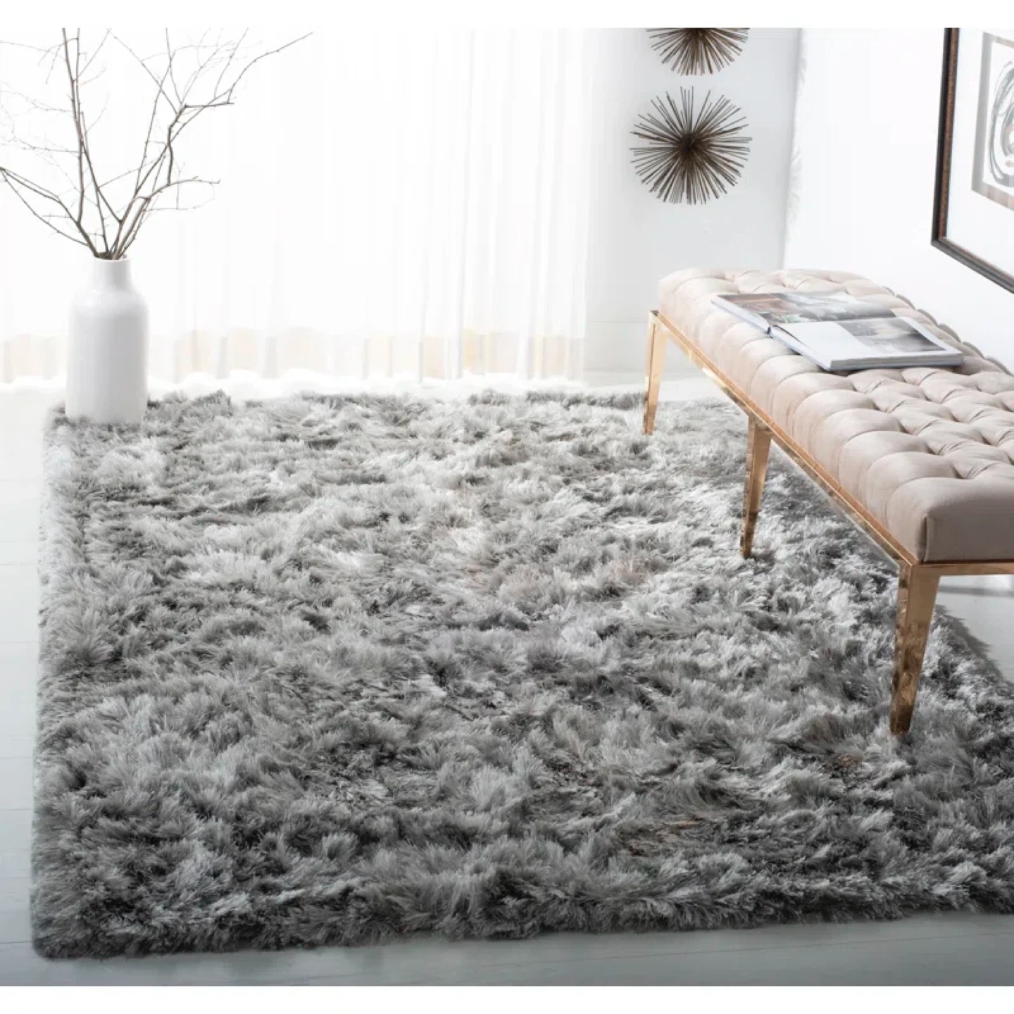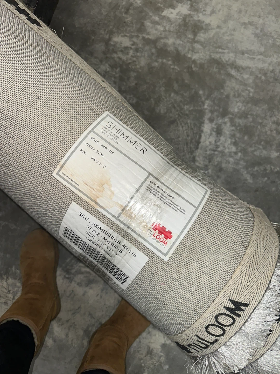 This is a NuLoom Shimmer rug. It's silver in color and measures 8'6" by 11'6". The rug is made of 100% polyester. It's a plush shag style that adds warmth to any room!