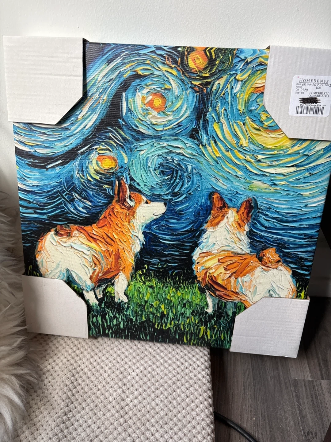 Homesense canvas print featuring corgis in a Starry Night-inspired scene. It's a vibrant piece with textured paint application. This wall art would be a charming addition to any dog lover's home!