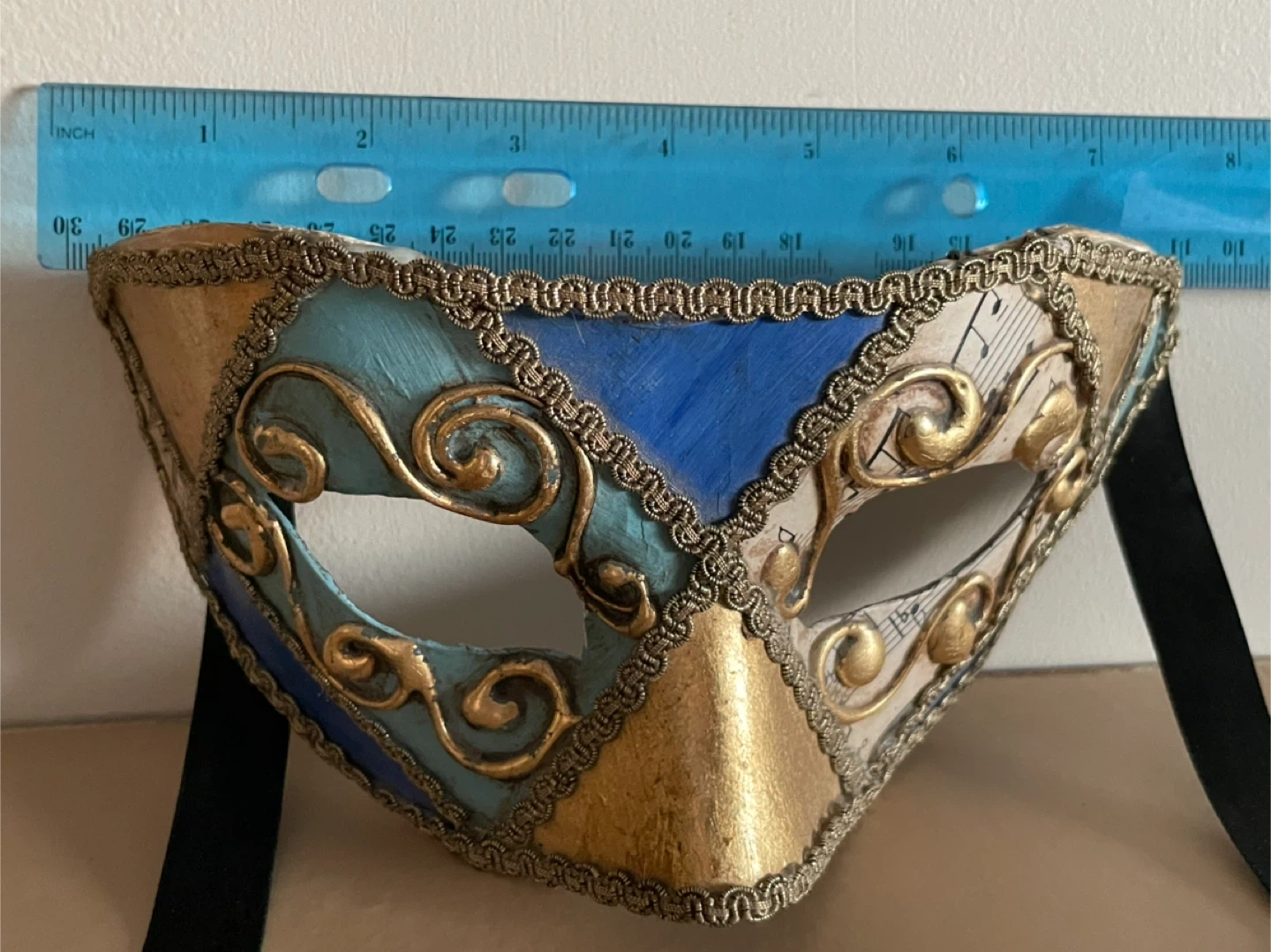 This masquerade mask is adorned with musical notes and a gold scroll design. It features a patchwork of blue and gold panels, trimmed with ornate gold braiding. It's secured with black ribbon ties.