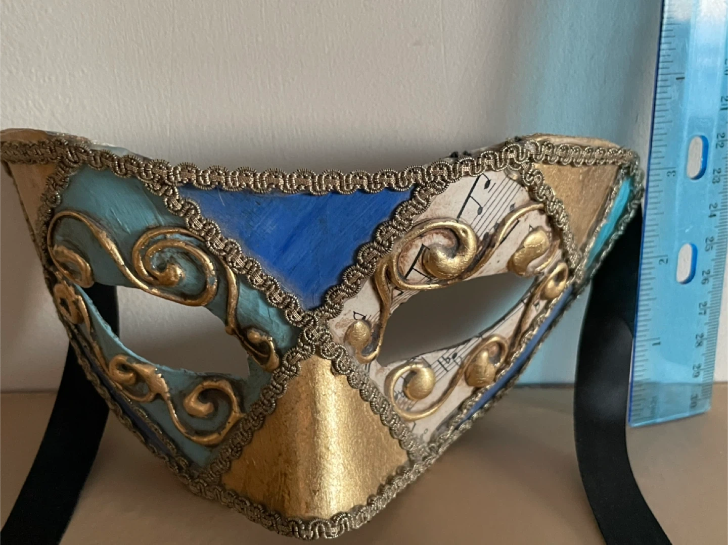 This masquerade mask is adorned with musical notes and a gold scroll design. It features a patchwork of blue and gold panels, trimmed with ornate gold braiding. It's secured with black ribbon ties.
