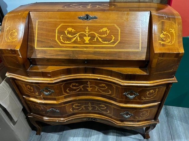 This used Italian-made secretary desk features exquisite marquetry inlay and offers a blend of storage and workspace with its drop-front writing surface and multiple drawers. The desk shows signs of wear consistent with its age, which adds to its vintage charm. Made in Italy, Marquetry Inlay, Drop-front writing surface, Multiple drawers for storage. This desk has character and is a real conversation piece. I've seen similar desks listed on Kijiji for around $600, so I've priced this one fairly considering its condition. If the ad is up, it's available.