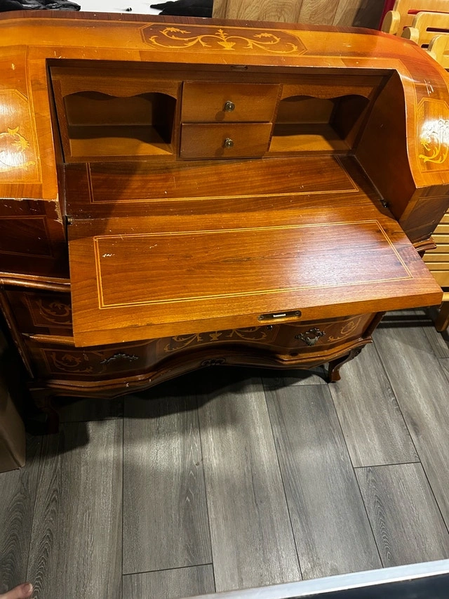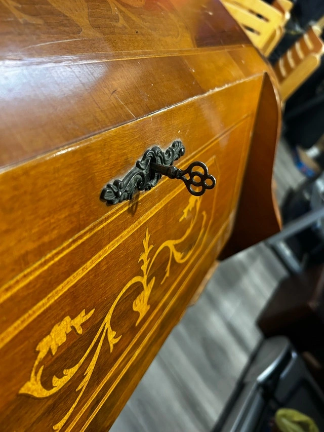 This used Italian-made secretary desk features exquisite marquetry inlay and offers a blend of storage and workspace with its drop-front writing surface and multiple drawers. The desk shows signs of wear consistent with its age, which adds to its vintage charm. Made in Italy, Marquetry Inlay, Drop-front writing surface, Multiple drawers for storage. This desk has character and is a real conversation piece. I've seen similar desks listed on Kijiji for around $600, so I've priced this one fairly considering its condition. If the ad is up, it's available.