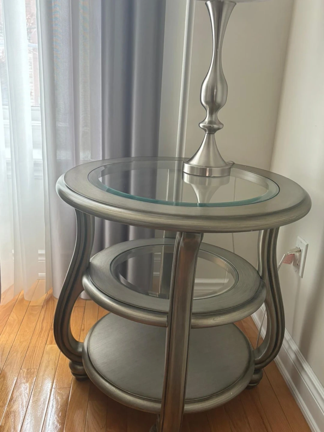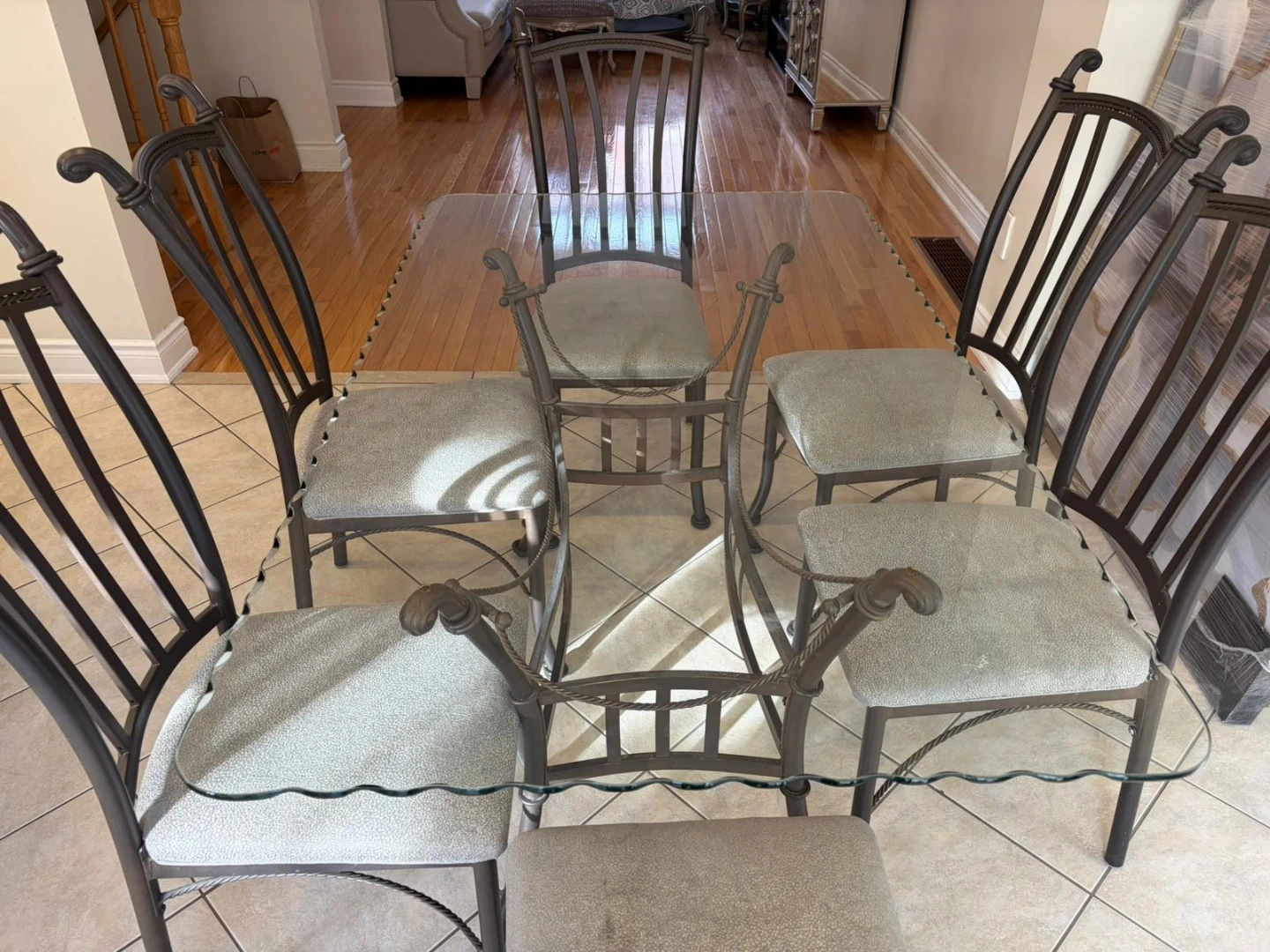 A lovely glass top dining table with six matching chairs. The table has a glass top and a metal base with intricate detailing. The chairs are upholstered in a neutral fabric and have metal frames. This set is perfect for intimate family dinners or entertaining guests. Also available are 3 pieces coffee set