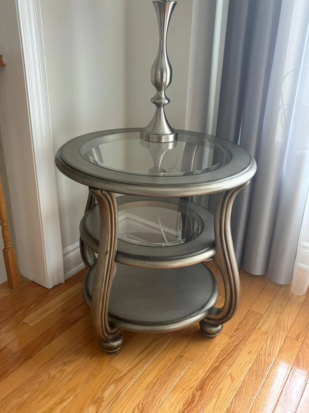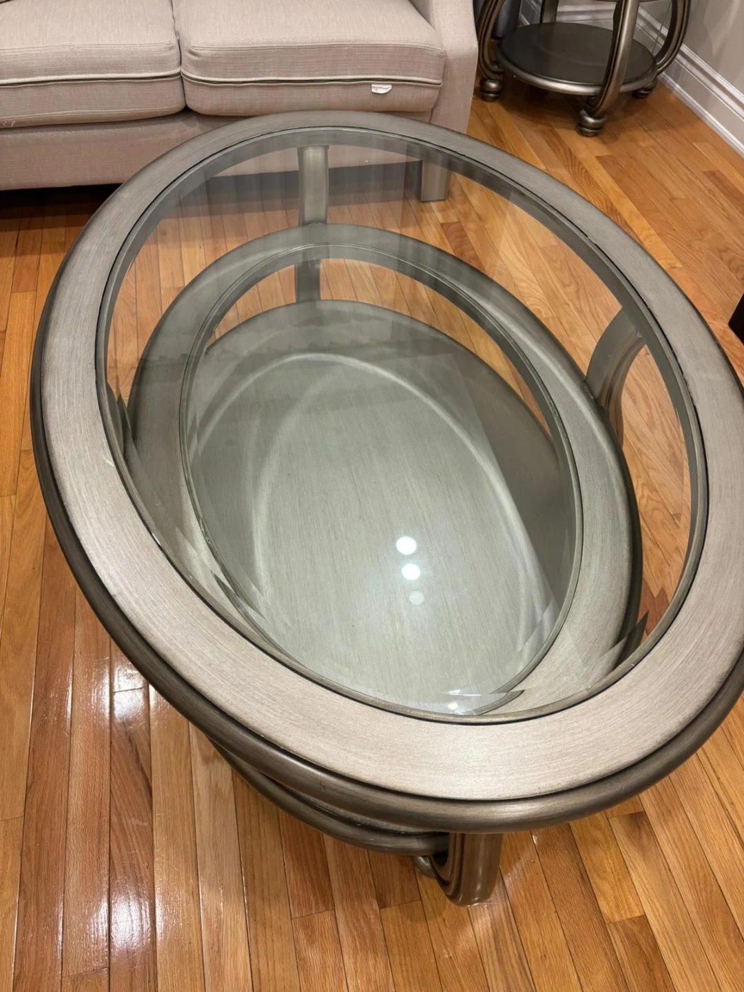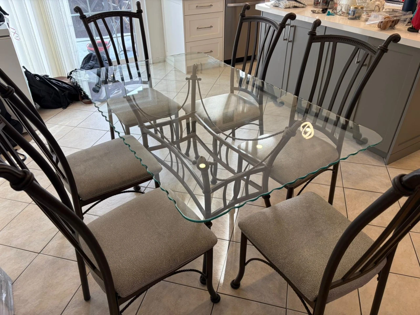 A lovely glass top dining table with six matching chairs. The table has a glass top and a metal base with intricate detailing. The chairs are upholstered in a neutral fabric and have metal frames. This set is perfect for intimate family dinners or entertaining guests. Also available are 3 pieces coffee set