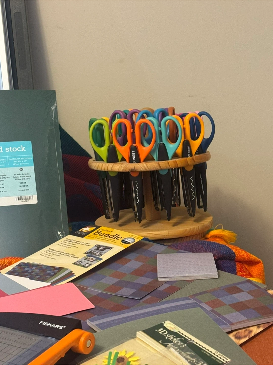 This is a large lot of crafting supplies. It includes Stampin' Up! card stock in various colours, many rubber stamps with different designs and sentiments, and several paper trimmers. There are also various embellishments and tools included for your crafting projects!