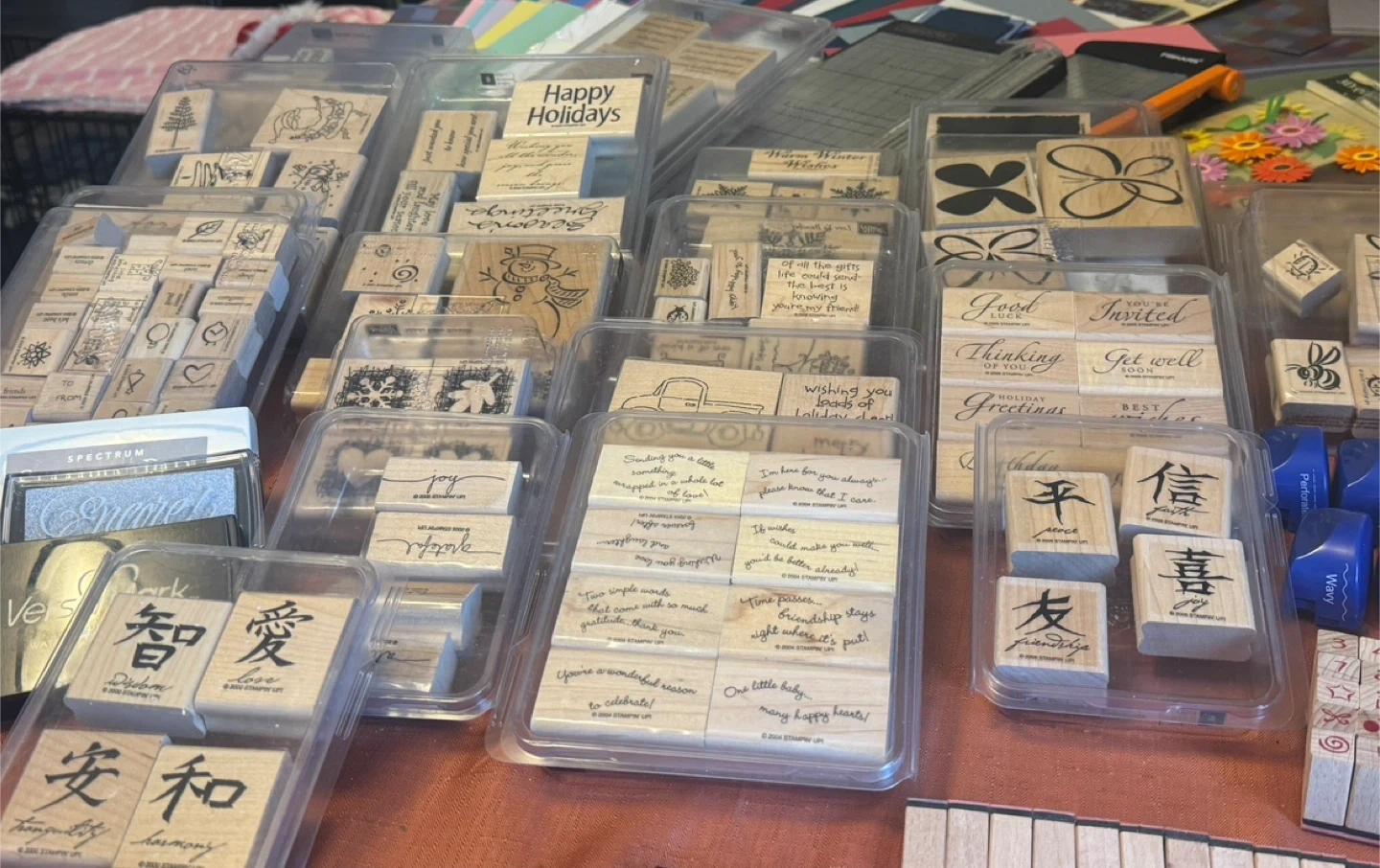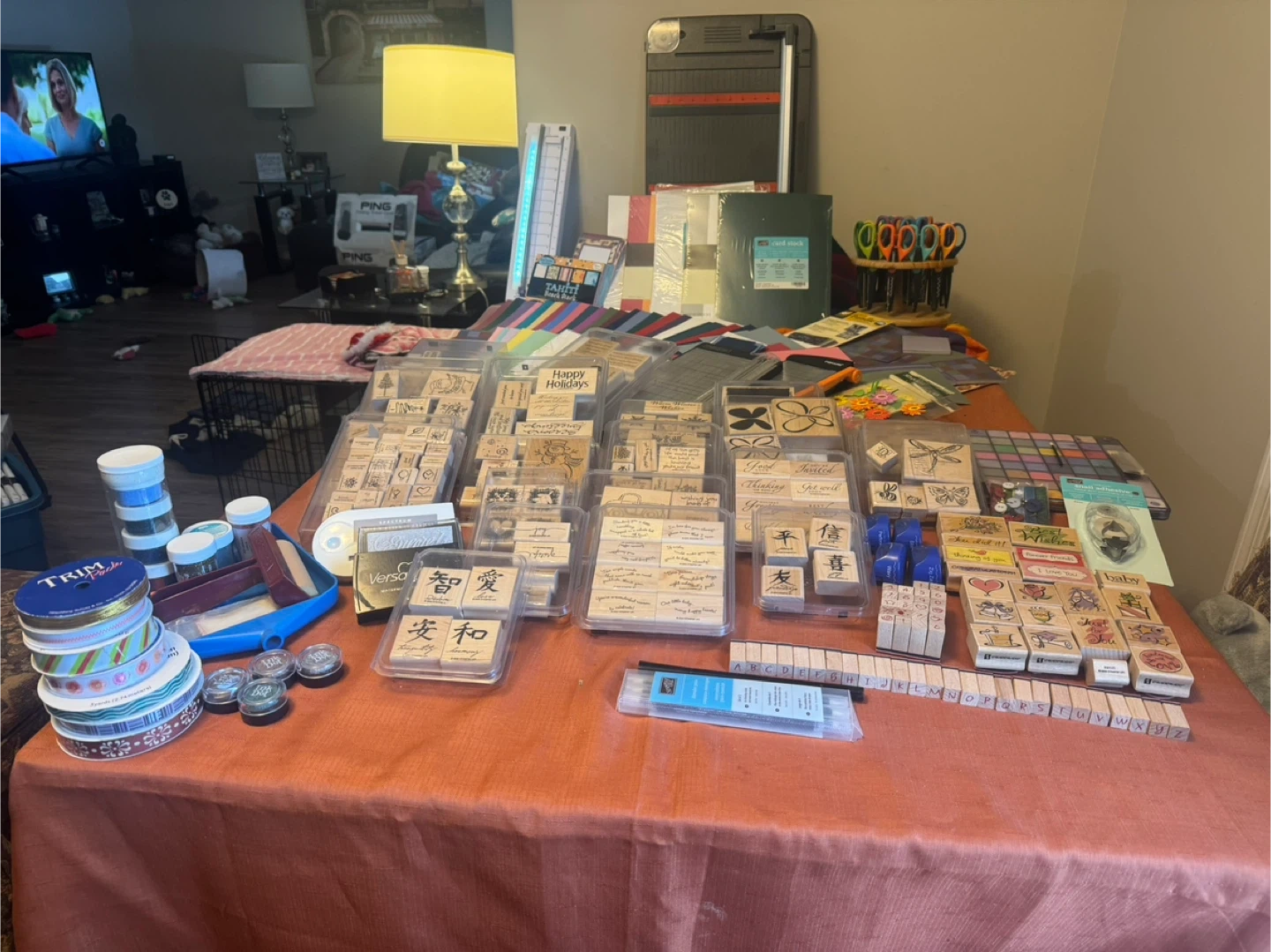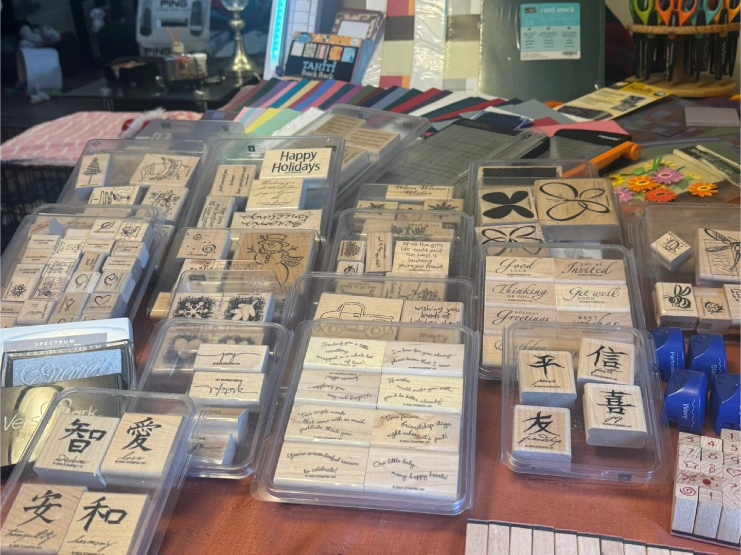 This is a large lot of crafting supplies. It includes Stampin' Up! card stock in various colours, many rubber stamps with different designs and sentiments, and several paper trimmers. There are also various embellishments and tools included for your crafting projects!