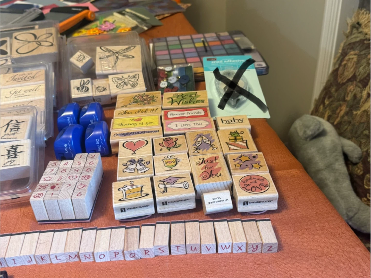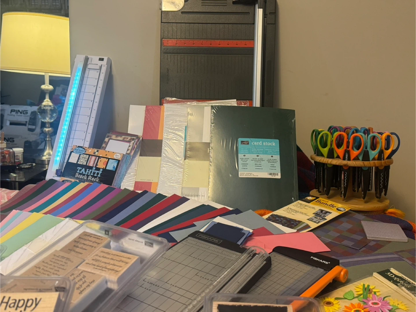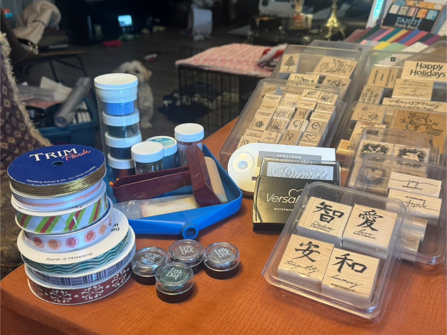 This is a large lot of crafting supplies. It includes Stampin' Up! card stock in various colours, many rubber stamps with different designs and sentiments, and several paper trimmers. There are also various embellishments and tools included for your crafting projects!