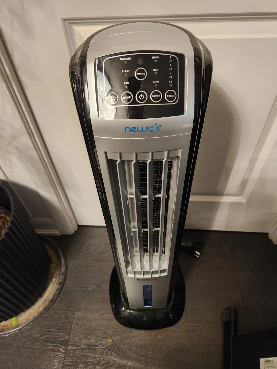 This NewAir evaporative cooler has multiple modes, including nature, sleep, and fan. It also has adjustable speed settings and a timer. The unit is black and silver.