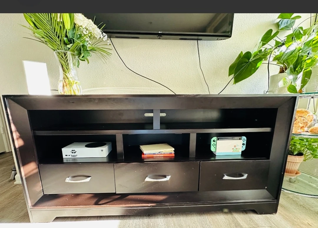 Dark brown TV stand featuring open shelves for media devices and three drawers for storage. It's a solid piece with a modern design.