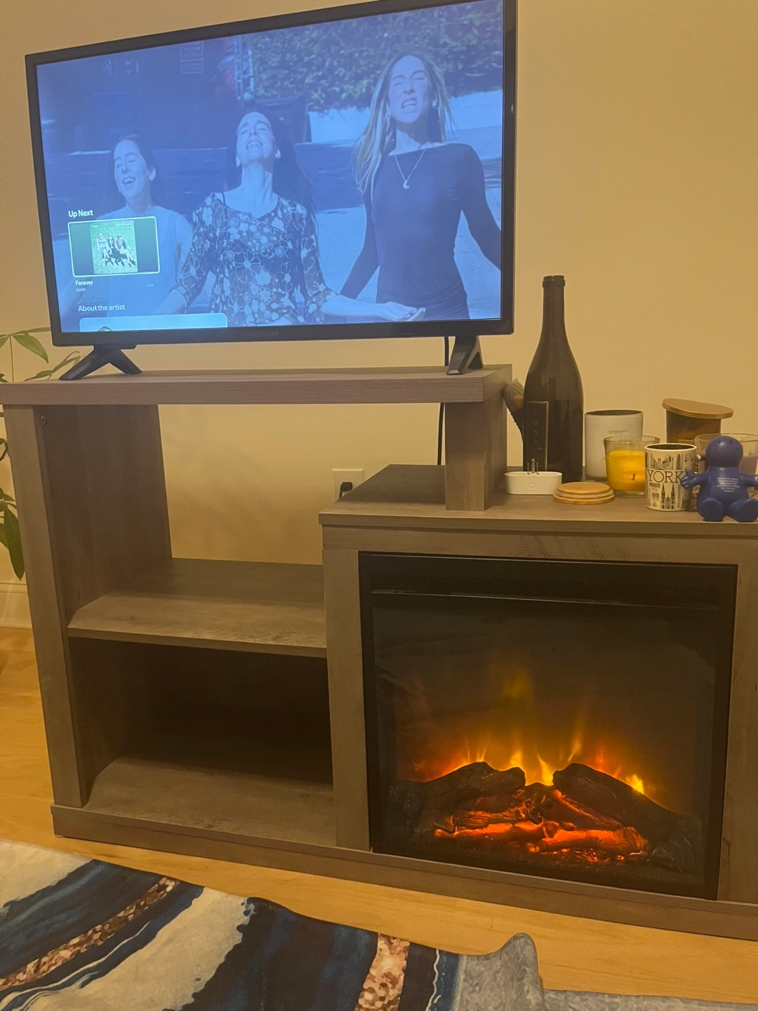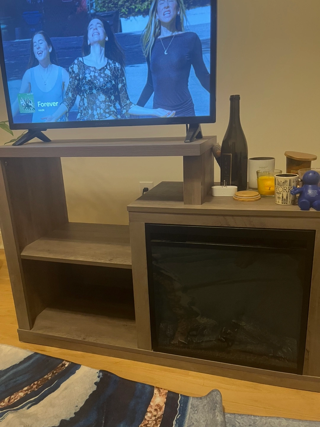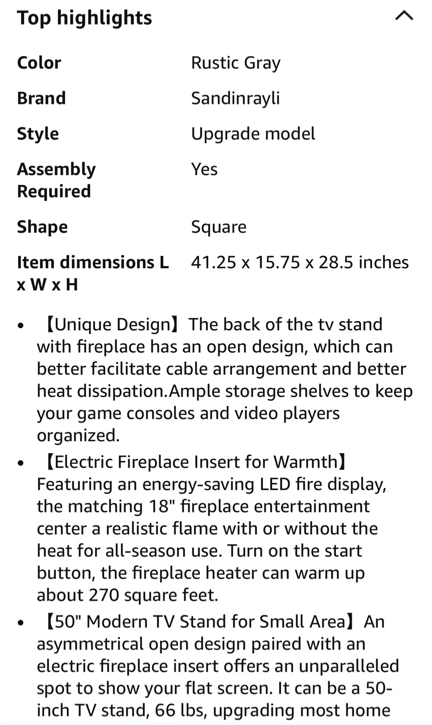 Selling a Sandinrayli Fireplace TV Stand in rustic gray! It's an upgrade model with a square shape. The dimensions are 41.25 x 15.75 x 28.5 inches. It fits TVs up to 50 inches and has an 18" electric fireplace insert. It also features ample storage shelves to keep your game consoles and video players organized. The heater/fireplace is detachable.