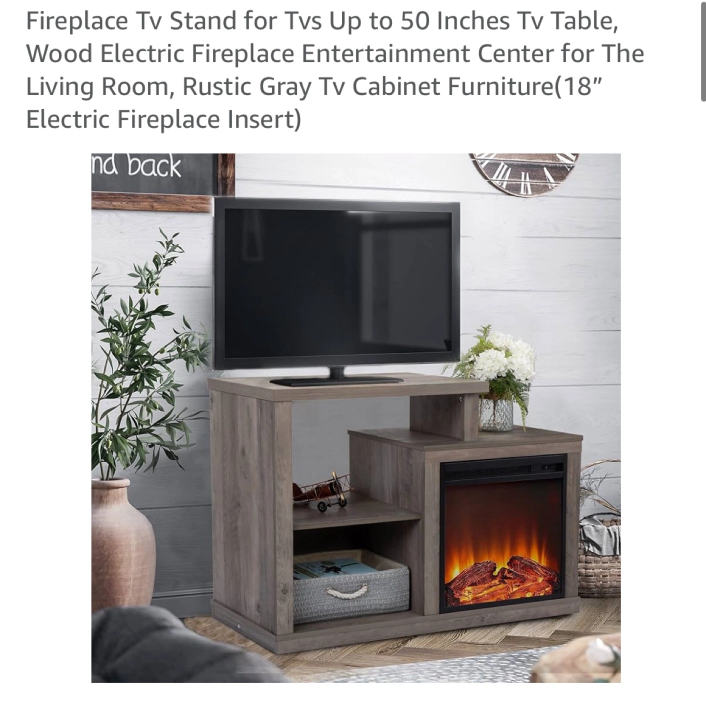 Selling a Sandinrayli Fireplace TV Stand in rustic gray! It's an upgrade model with a square shape. The dimensions are 41.25 x 15.75 x 28.5 inches. It fits TVs up to 50 inches and has an 18" electric fireplace insert. It also features ample storage shelves to keep your game consoles and video players organized. The heater/fireplace is detachable.