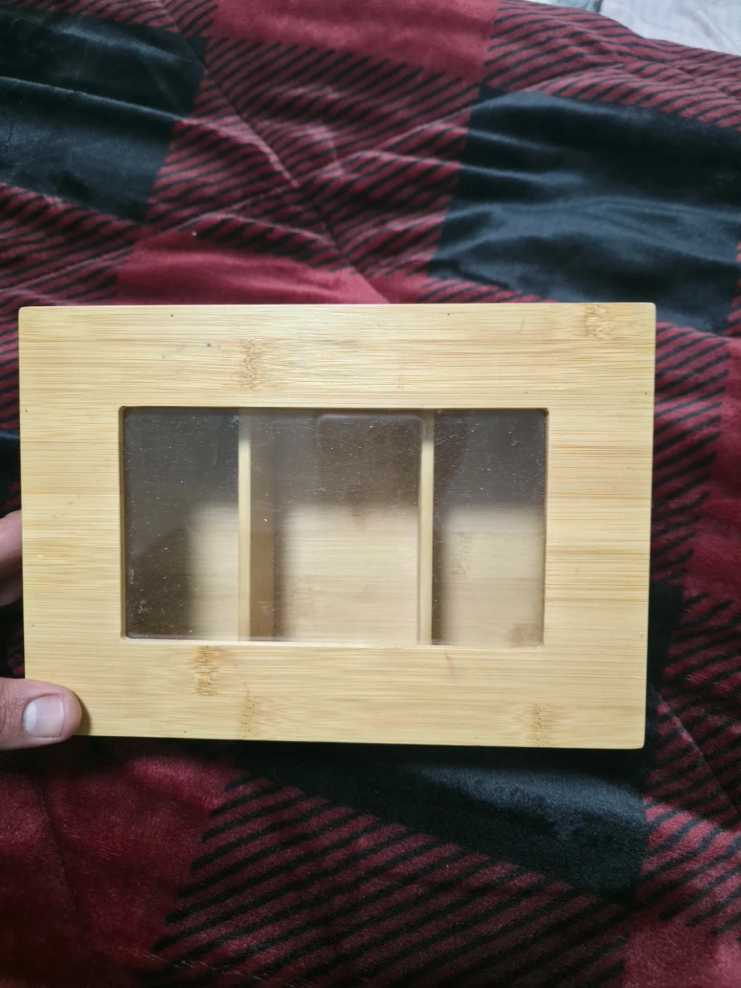 This is a natural bamboo storage box with a clear viewing lid. It features three compartments inside for organizing small items. It's made from a durable bamboo material.
