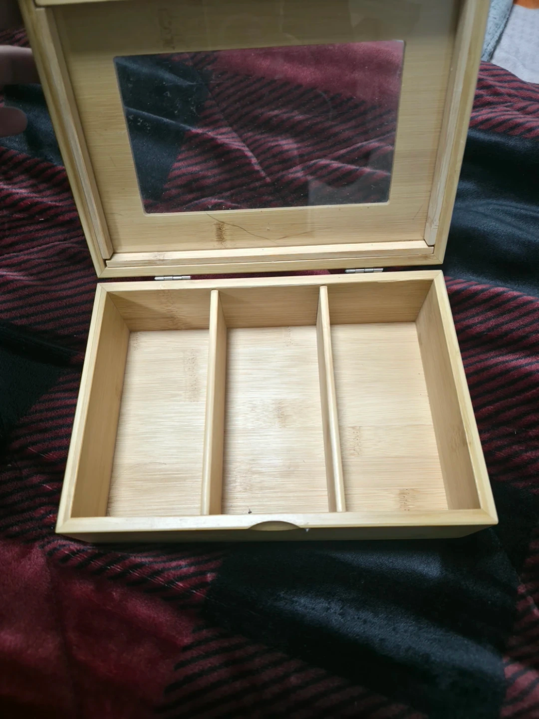 This is a natural bamboo storage box with a clear viewing lid. It features three compartments inside for organizing small items. It's made from a durable bamboo material.