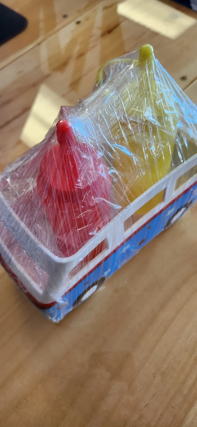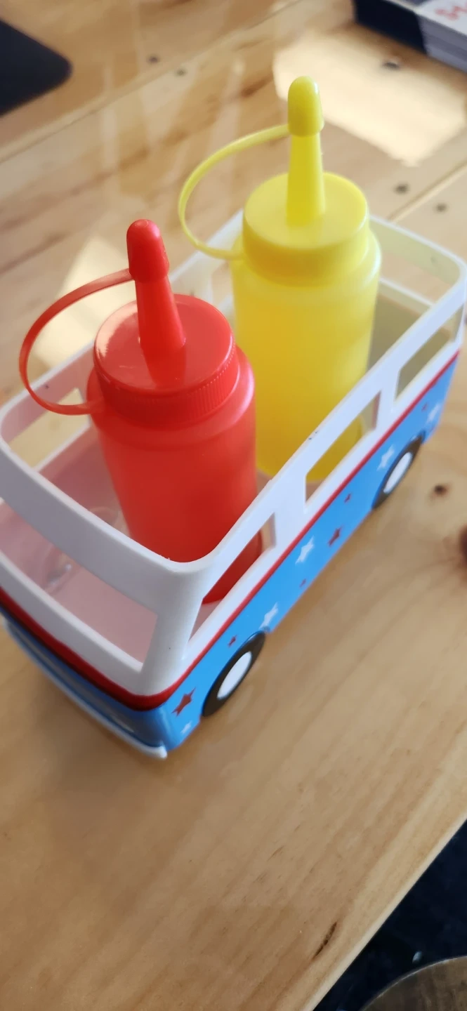 Cute bus-shaped holder for your ketchup and mustard squeeze bottles! It's made of plastic and perfect for BBQs or everyday use. Great for kids' meals or adding a fun touch to your table.