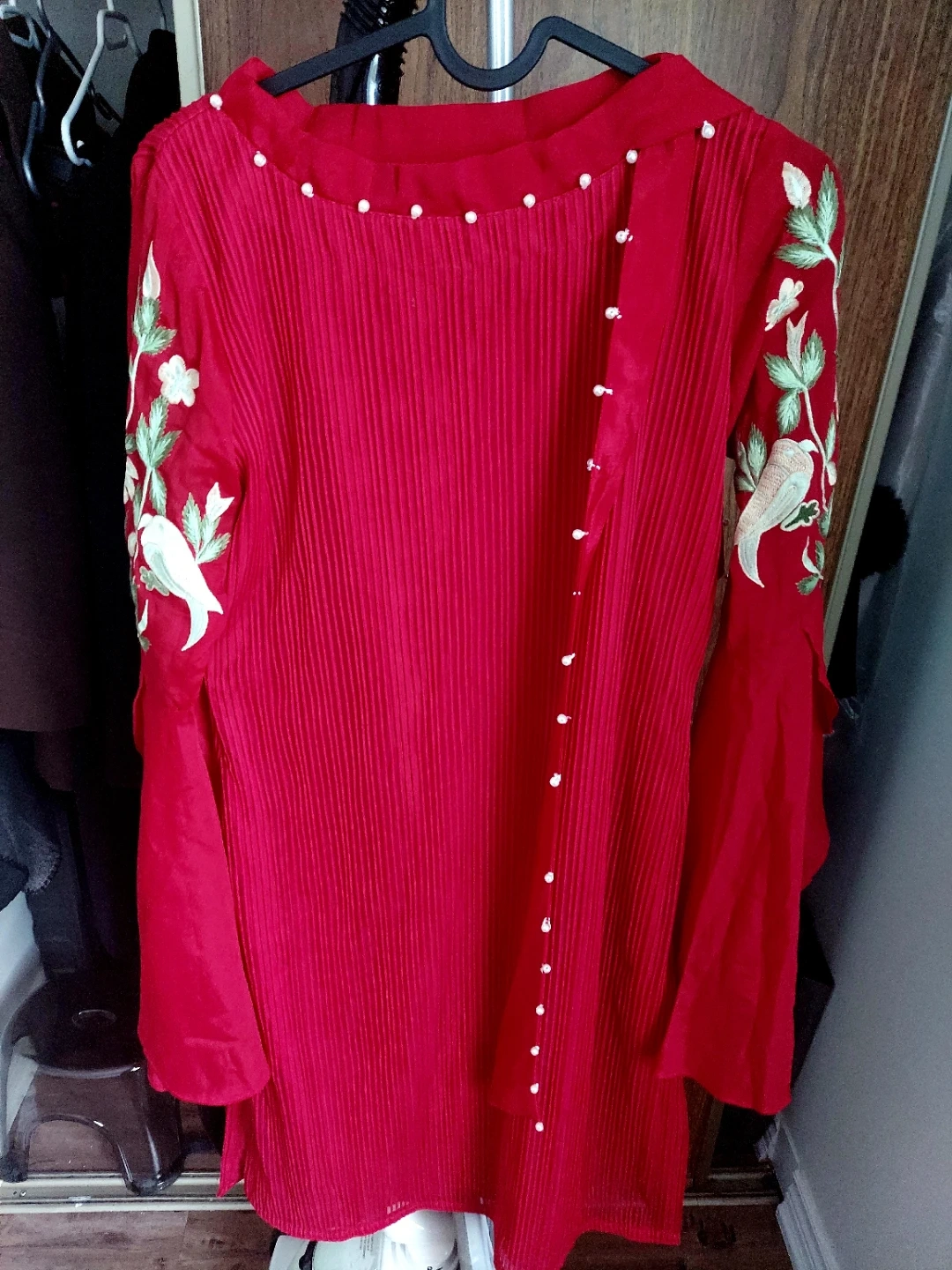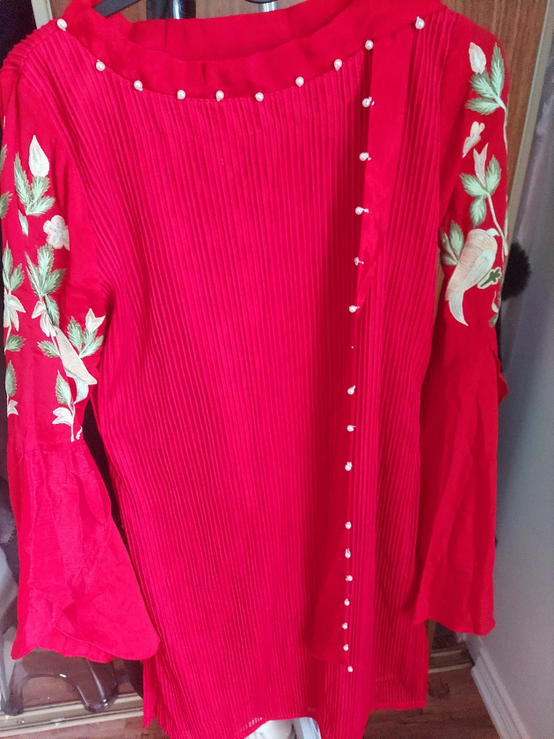 Bright red kurti with intricate embroidery on the sleeves and pearl detailing around the neckline. It features a pleated front and flared bell sleeves. Material is lightweight and flowy.