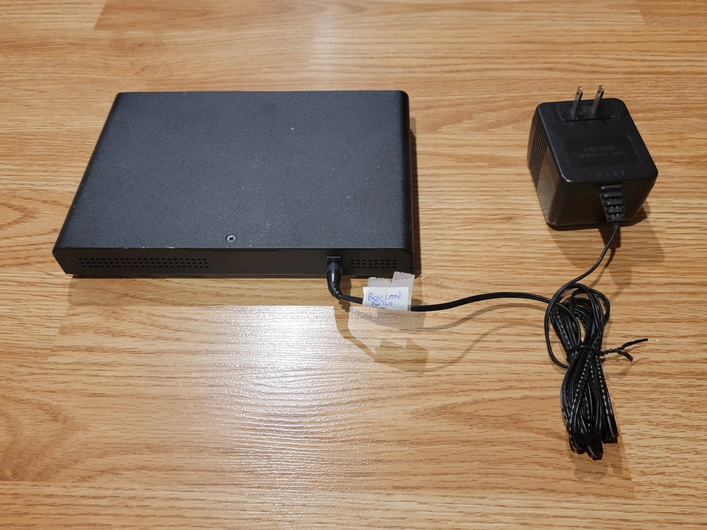 This is a BoseLAN BL-5505A 5-port 10/100 switch. It's made in the USA and comes with its power adapter. It supports 10/100 Mbps Ethernet speeds for all ports. It serves as a hub or switch to connect multiple devices (computers, servers, printers) within a local area network (LAN) to facilitate data communication.