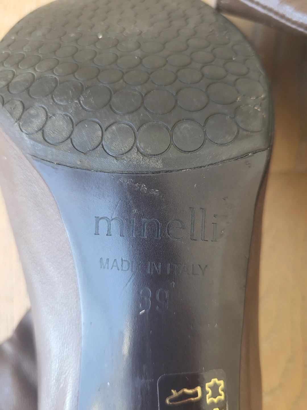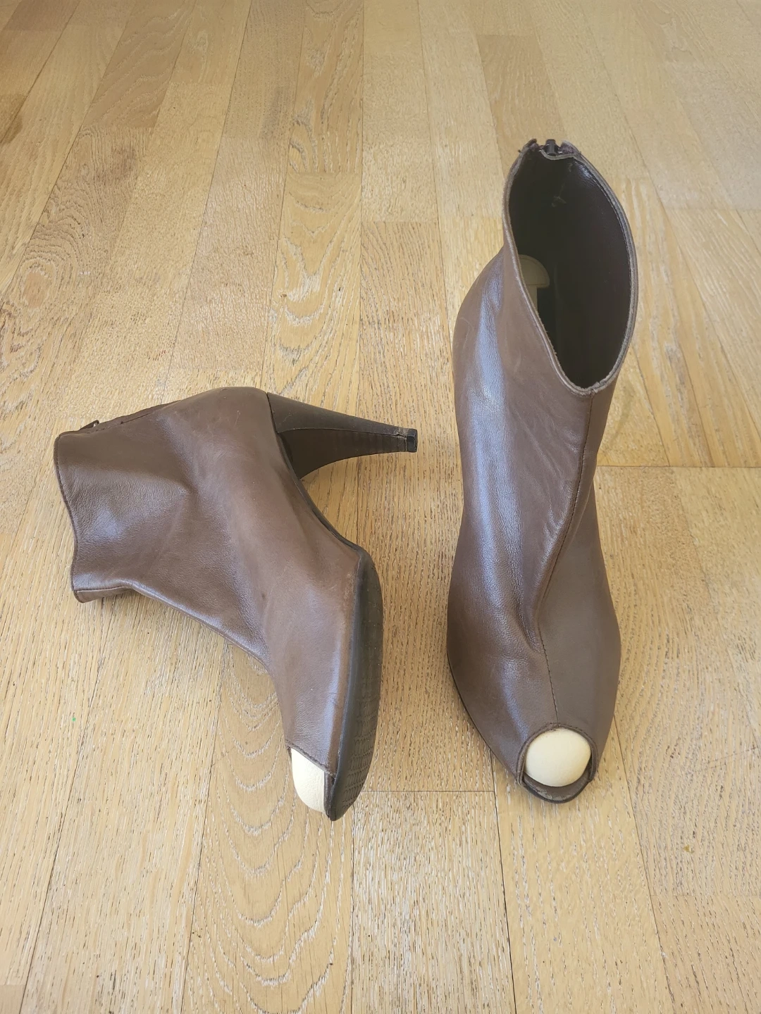 Minelli peep toe ankle boots made in Italy. Brown leather material, size 39. These stylish boots feature a zip closure at the back.