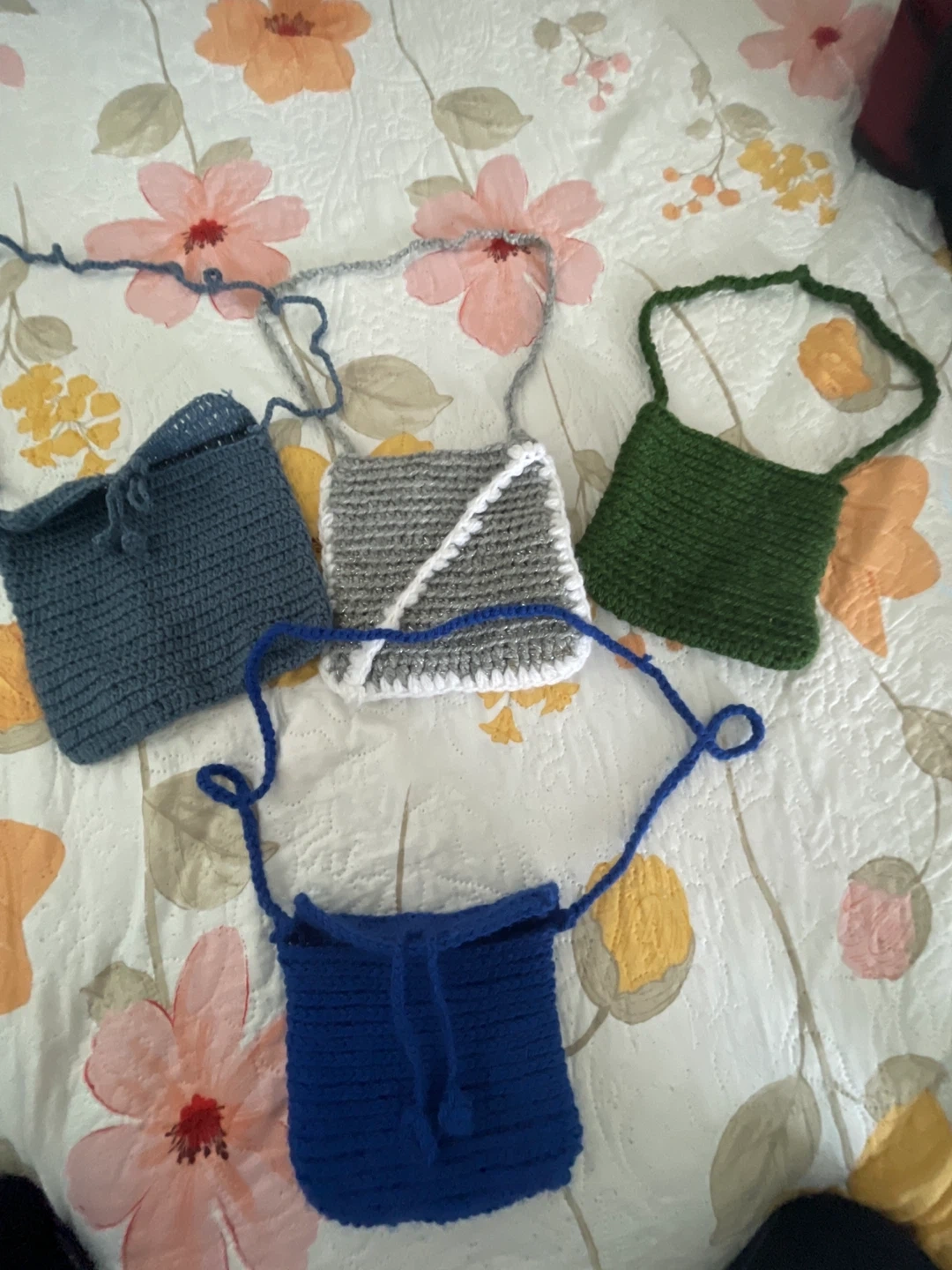 Set of four small, handmade crochet pouches in various colours including blue, green, grey, and dark grey. Each pouch has a drawstring closure and a strap for carrying. They're perfect for small trinkets or as party favours!