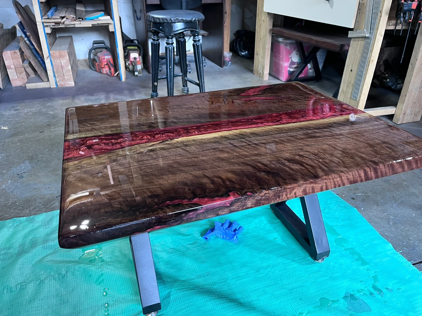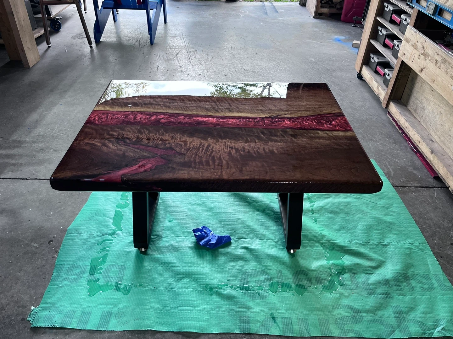 Handcrafted dark walnut 2” thick coffee table featuring a live edge wood slab with a striking red resin inlay. Its modern metal legs offer a sturdy foundation. This unique piece adds a touch of natural artistry to any living space!2 available 1 I still have to finish