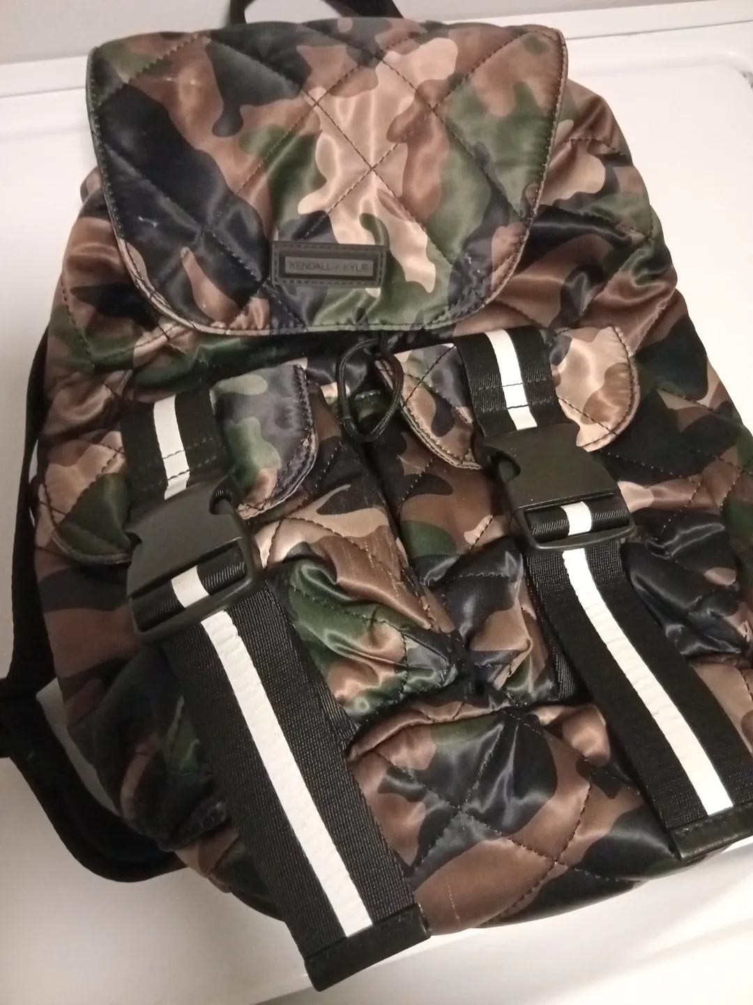 Quilted camouflage backpack from Kendall + Kylie. It has adjustable shoulder straps with white stripe detailing. Front flap closure with buckle and drawstring. It's made of a shiny satin-like material.