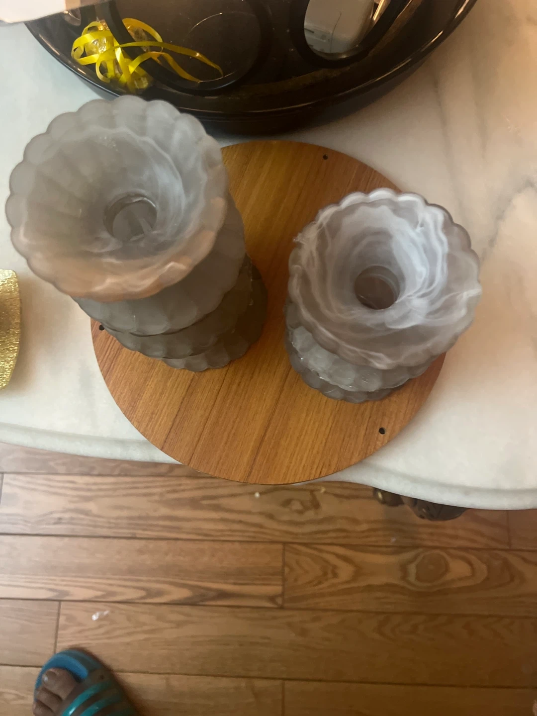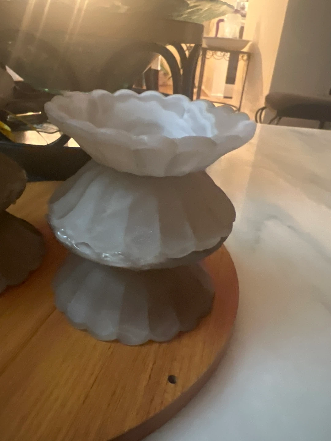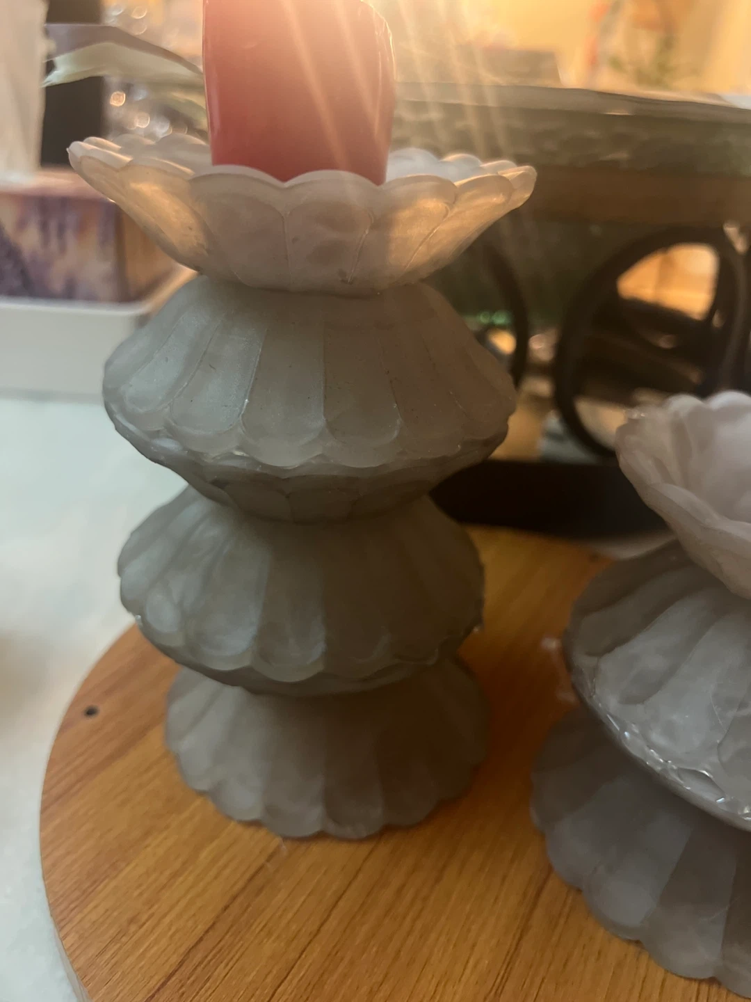Selling a set of two candlestick holders. They have a unique tiered design and are in great condition. Perfect for adding a touch of elegance to your home decor!