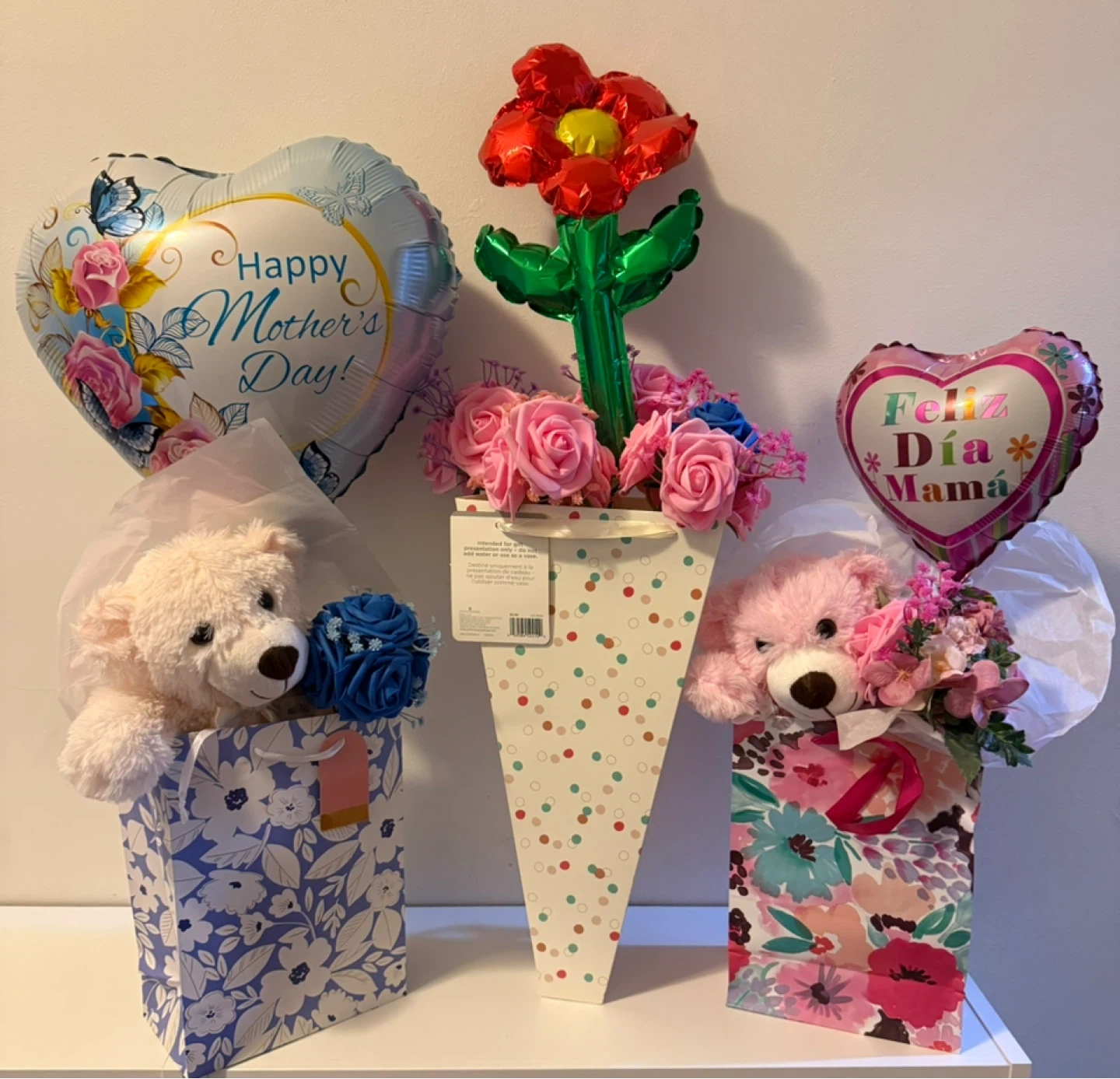 1 bear, 1 bag w/tissue, 1 artificial flower set, 1 balloon, and 1 card (per set)