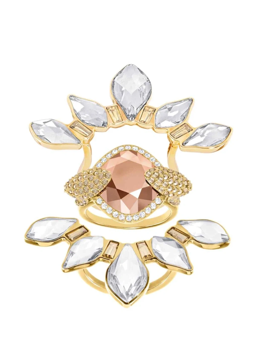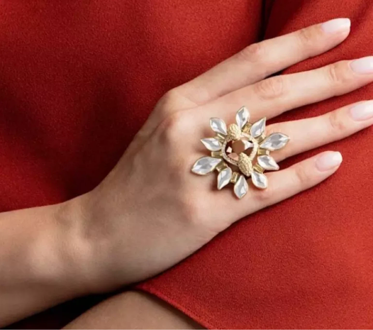 Statement ring featuring a large rose-colored central stone surrounded by sparkling clear crystals and smaller gold-toned accents. It showcases a floral-inspired design with petals crafted from clear baguette and marquise-cut crystals. This eye-catching piece adds a touch of glamour to any outfit! Can we worn as one or individually