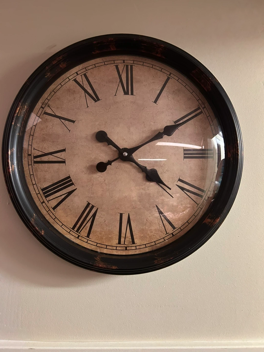 Selling a large wall clock with Roman numerals. It has a black frame and a vintage-style face. It's in excellent condition and would look lovely in any room