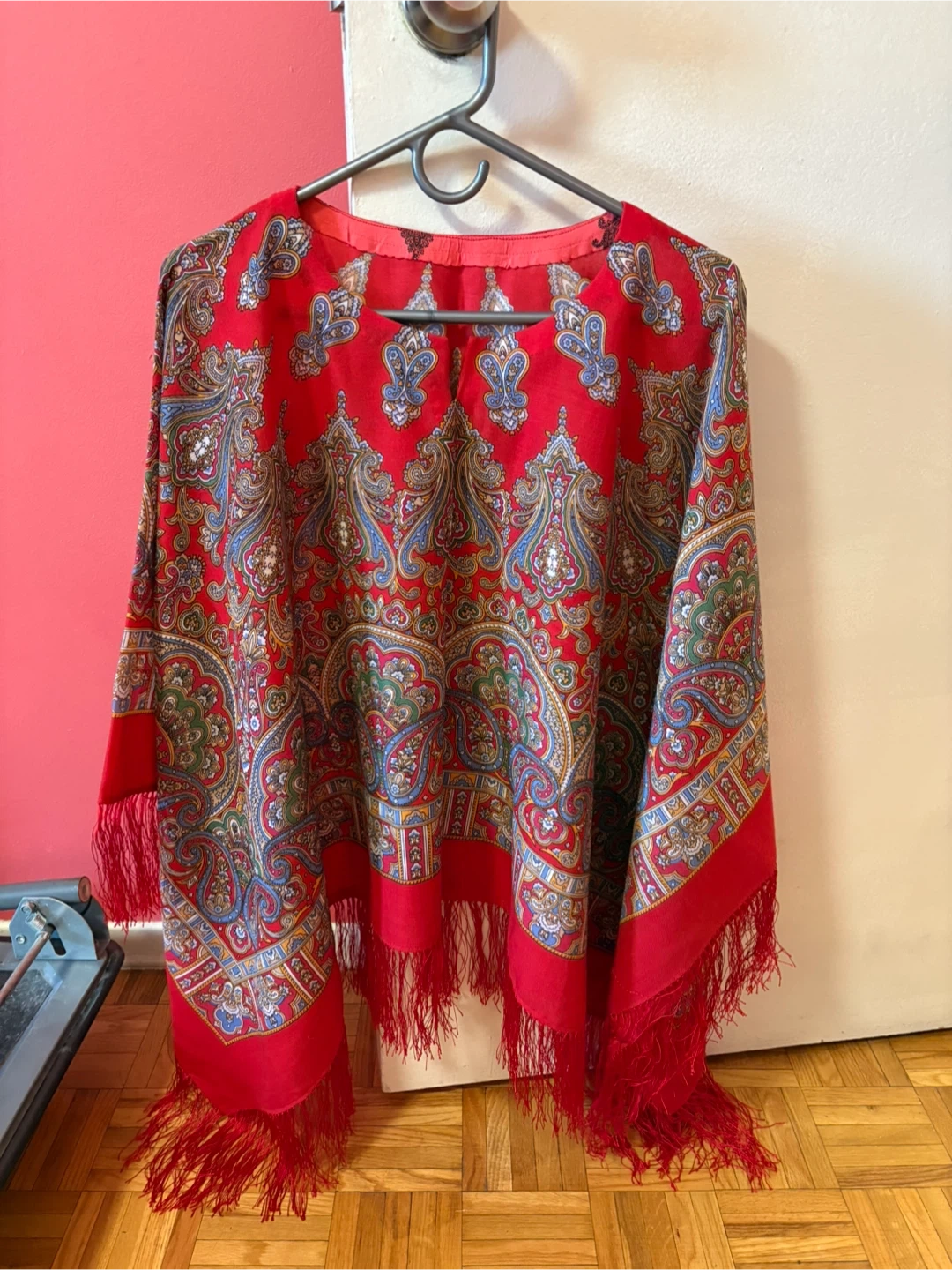 A vibrant red poncho featuring a classic paisley pattern and fringed hem. It's made of a lightweight fabric and offers a comfortable, stylish layer. This piece adds a touch of bohemian flair to any outfit!