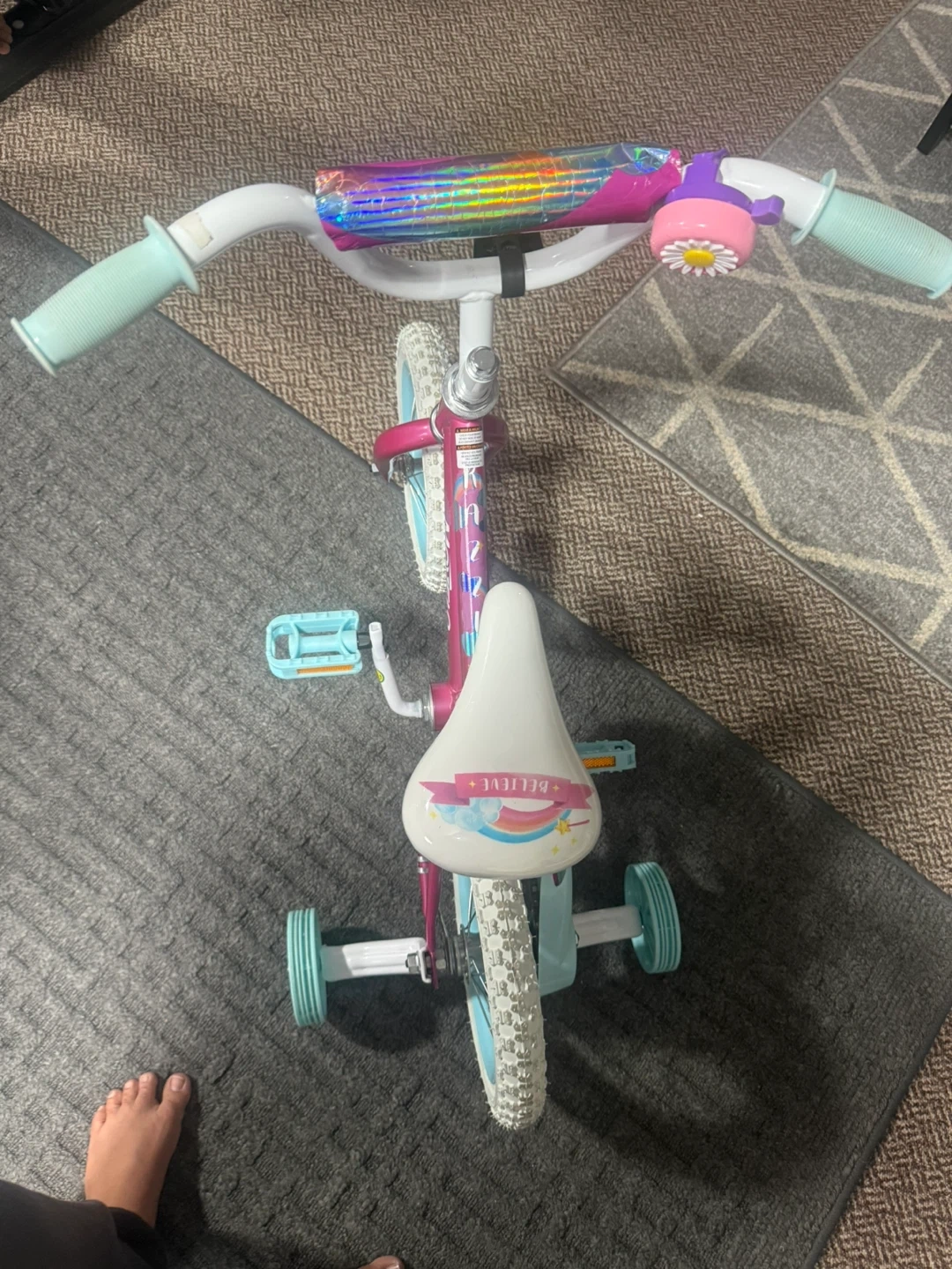 Selling a cute kids' bike! It's in good condition and comes with training wheels, perfect for a little one learning to ride. The bike features a fun design with colourful accents and a bell.
