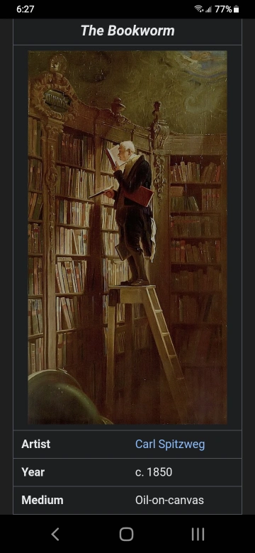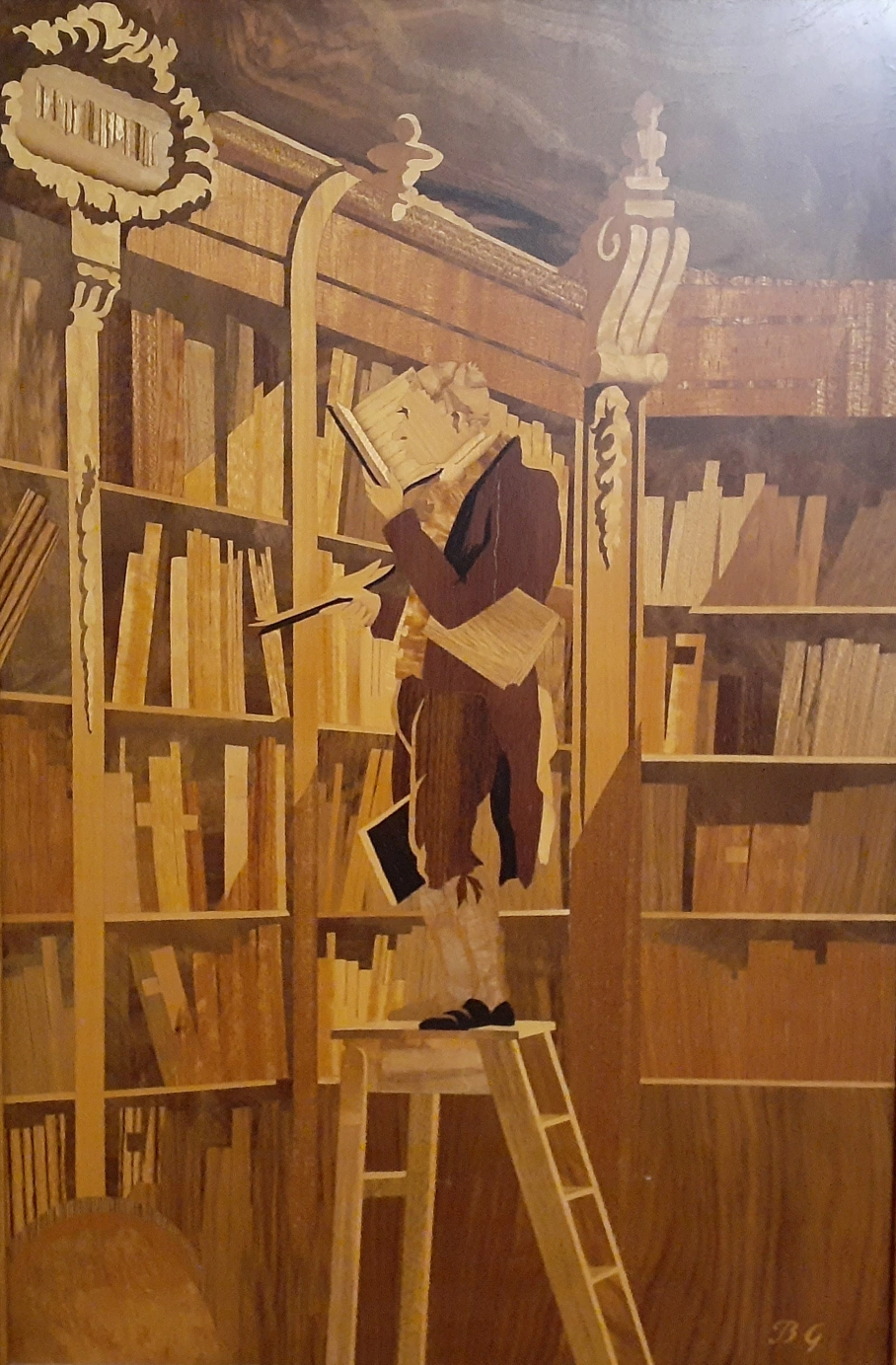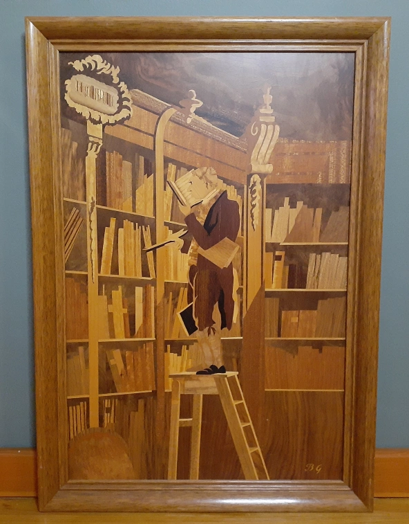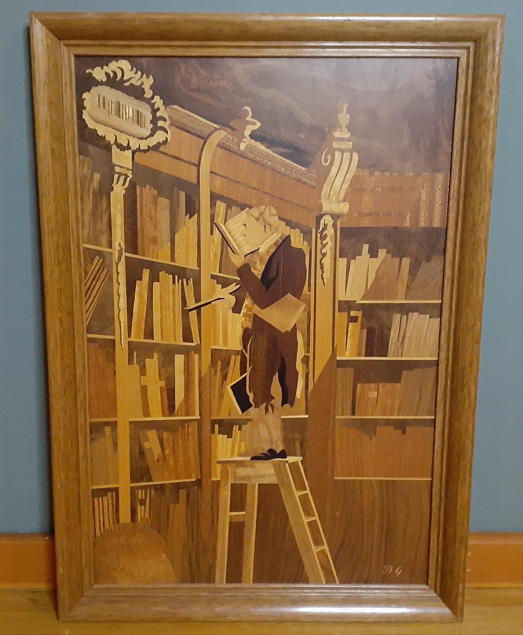 It's entitled: "The Book Worm", and is modeled after the 1850 painting by Carl Spitzweg.