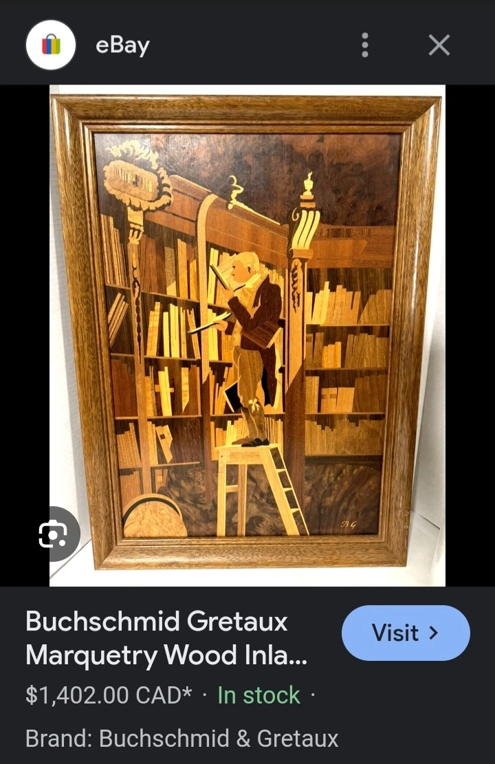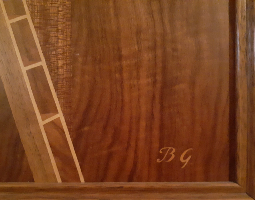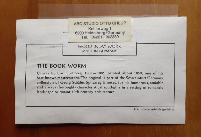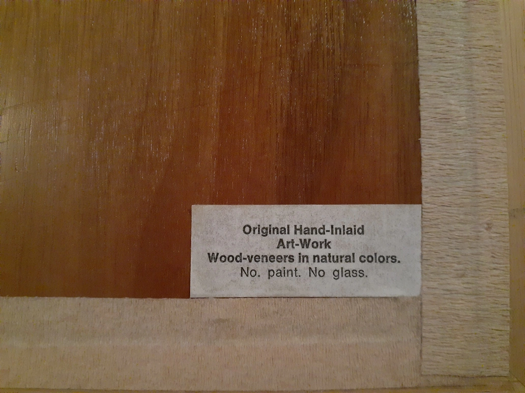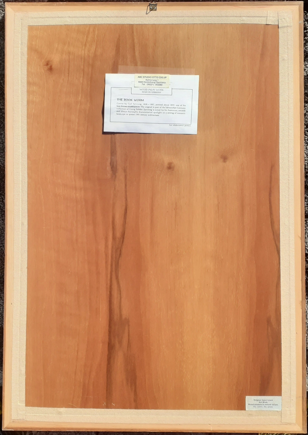 This mid century work of art was Made in Germany, by Buchschmid and Gretaux, and sold in Heidelberg by Otto Schlup, who was the principal representative of the Buchschmid and Gretaux Wood inlay company.
