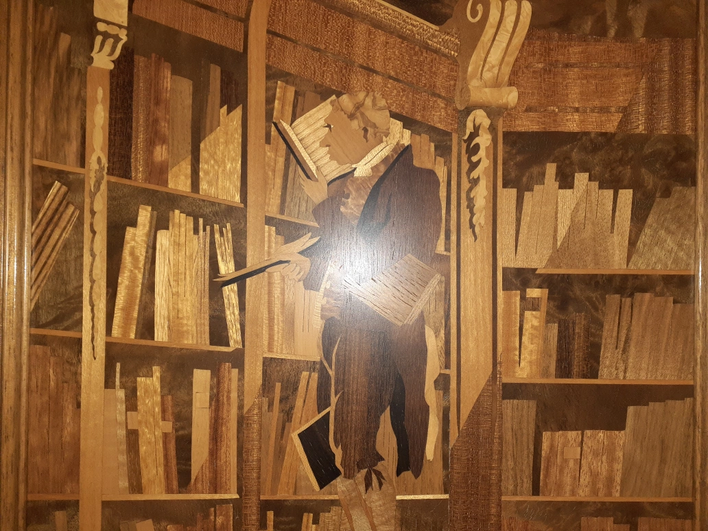 Extremely intricate marquetry composition, meticulously comprised of various shapes and types of inlaid wood.