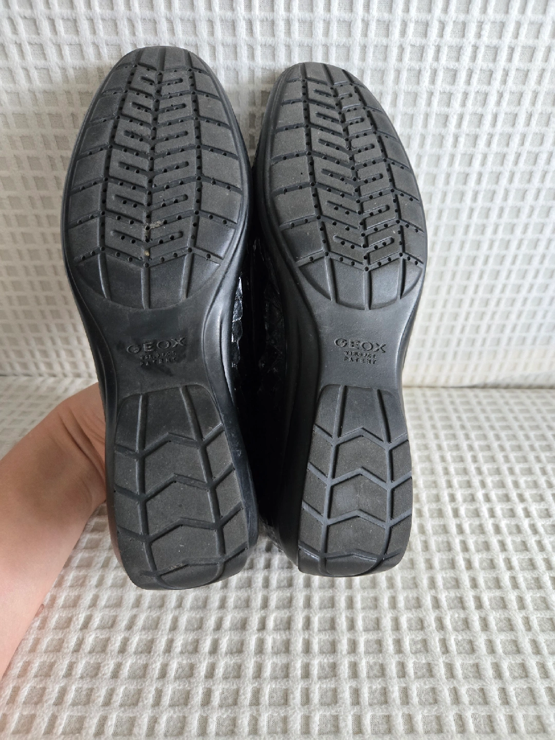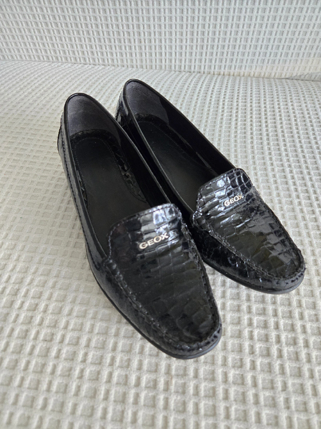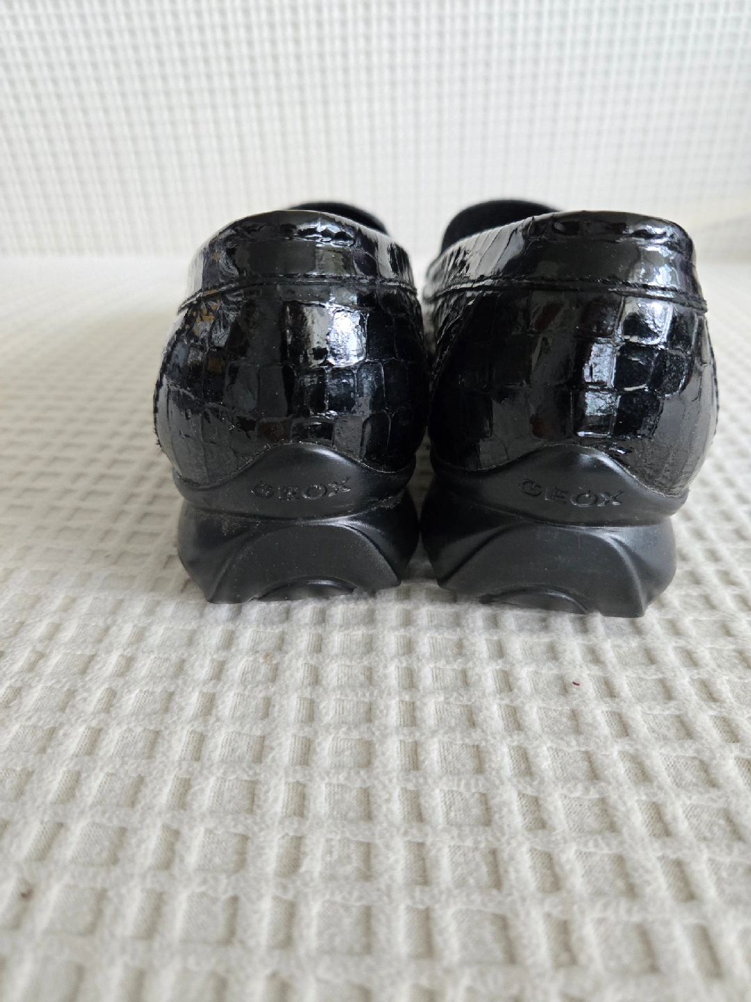 A pair of Geox black leather loafers with a crocodile-like texture and the Geox logo on the front. Would better fit US 6.5/7. They are in new condition, only worn once.