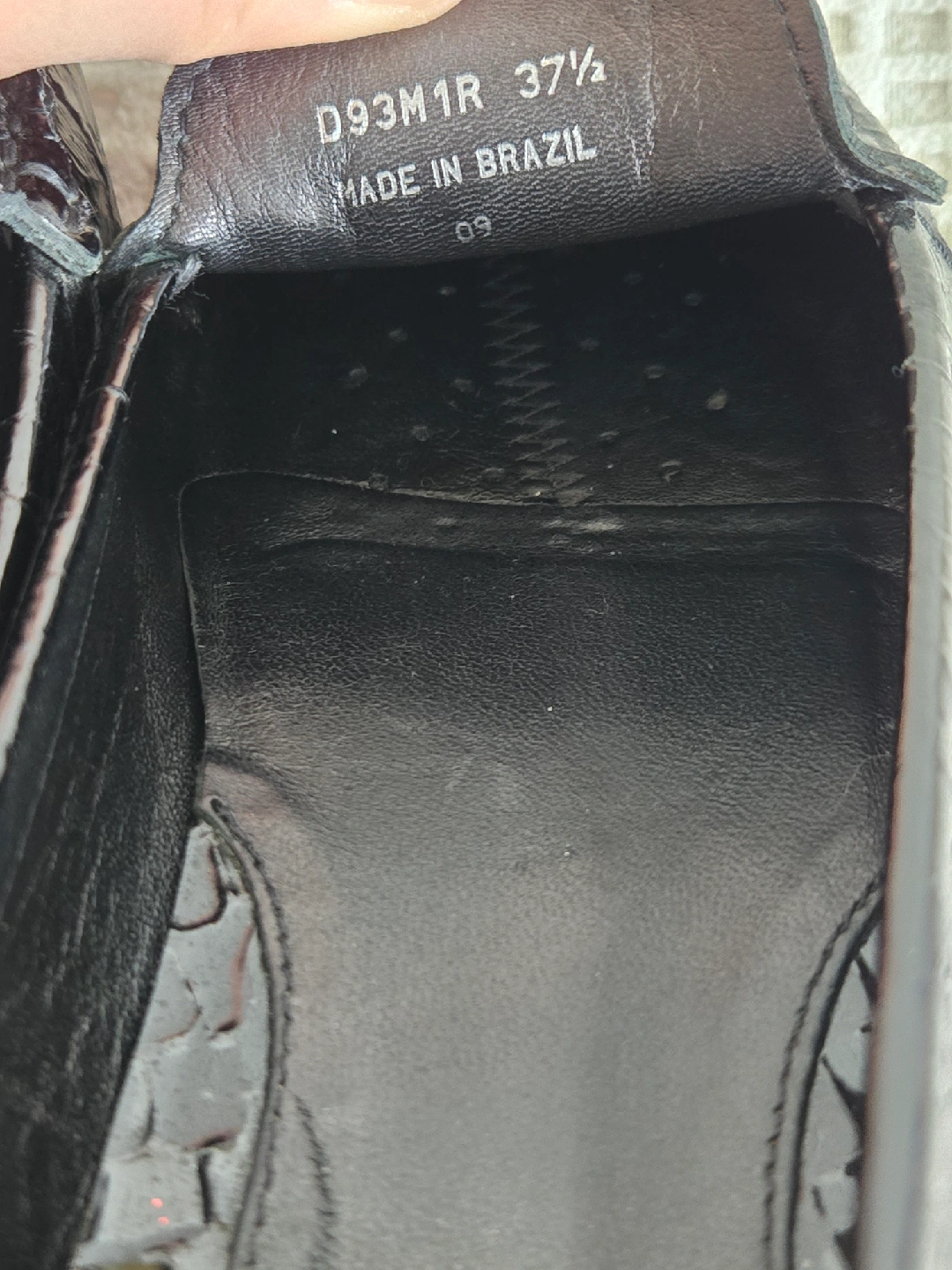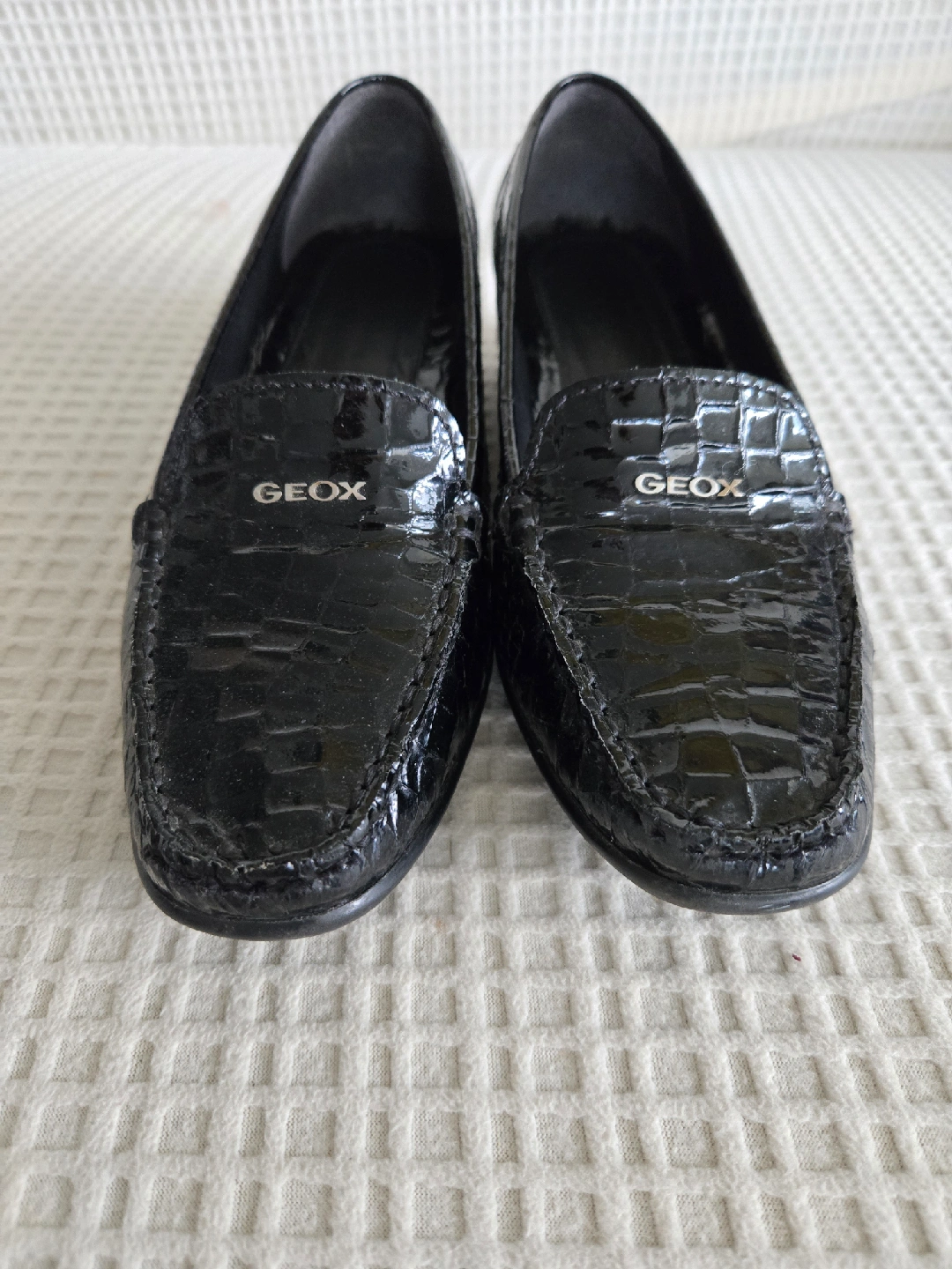 A pair of Geox black leather loafers with a crocodile-like texture and the Geox logo on the front. Would better fit US 6.5/7. They are in new condition, only worn once.