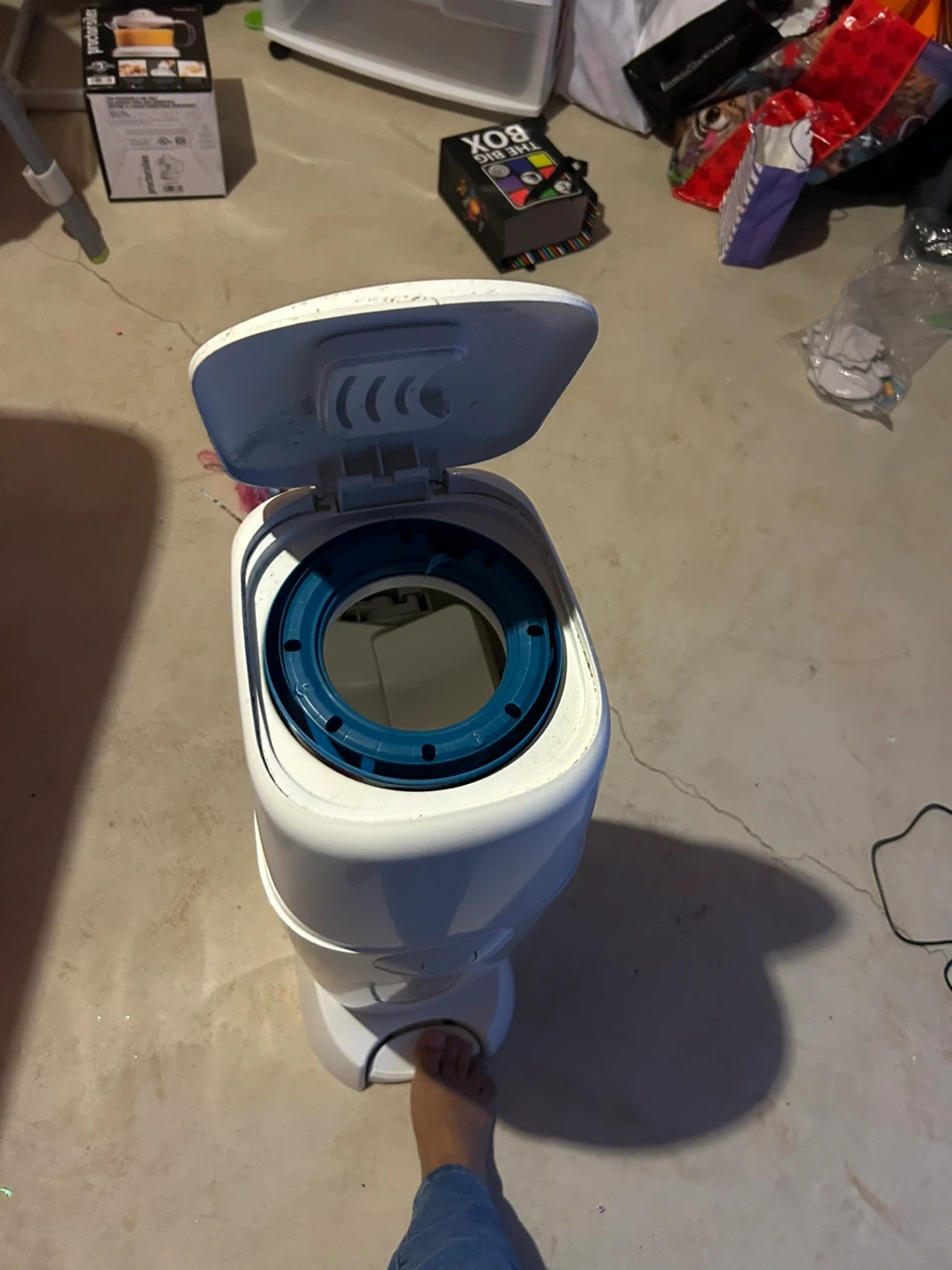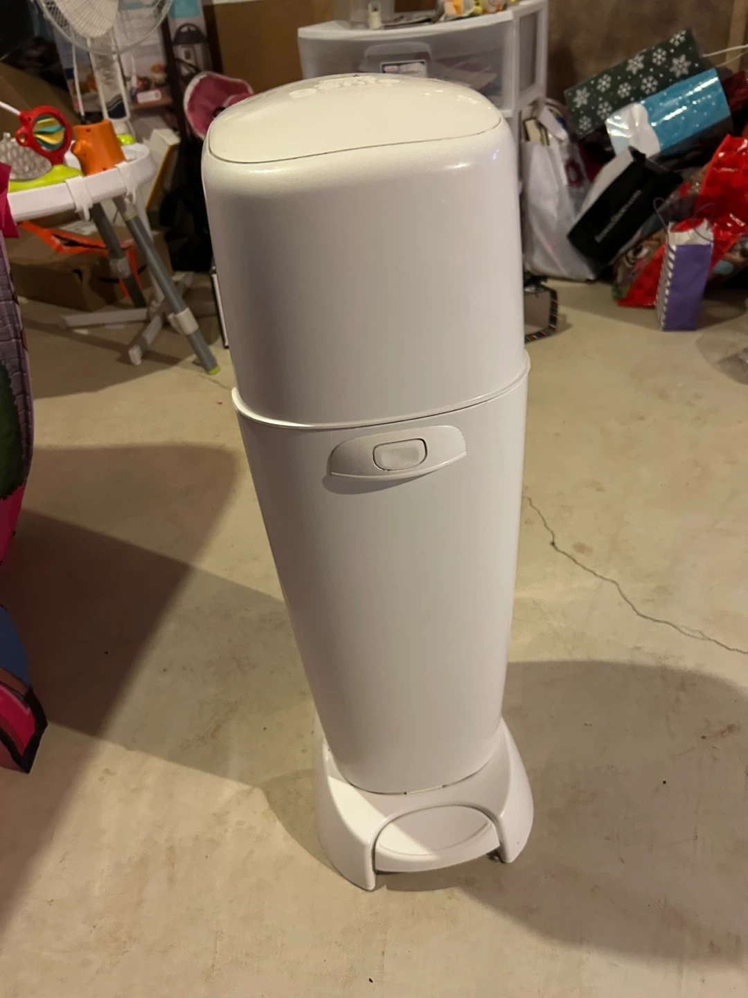 This is a Diaper Genie Complete diaper pail. It's designed to help control odours. It holds up to 10 diapers. This pail is useful for keeping nurseries fresh.