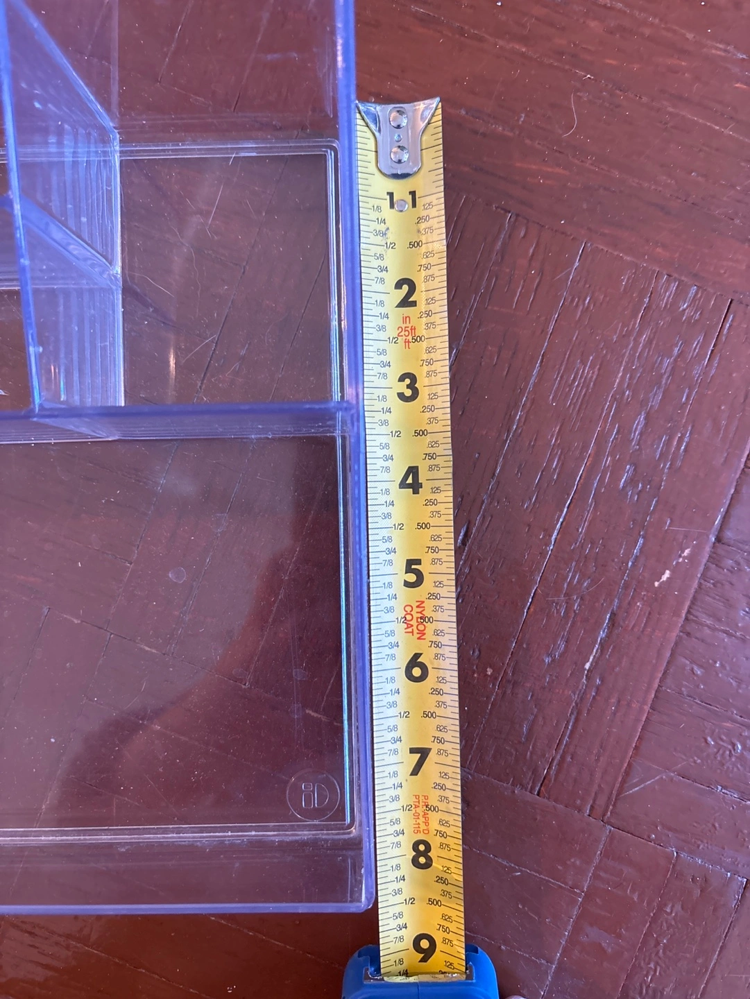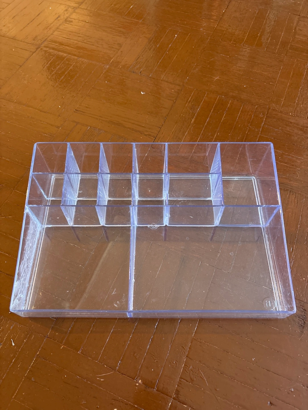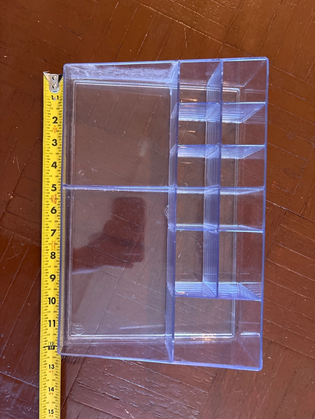 Clear plastic organizer with 10 compartments. Measures 12 inches long, 8 inches wide, and 3 inches high. Has visible wear but no structural damage.