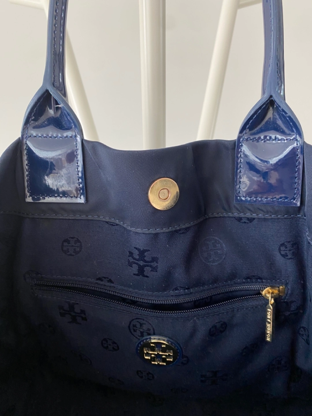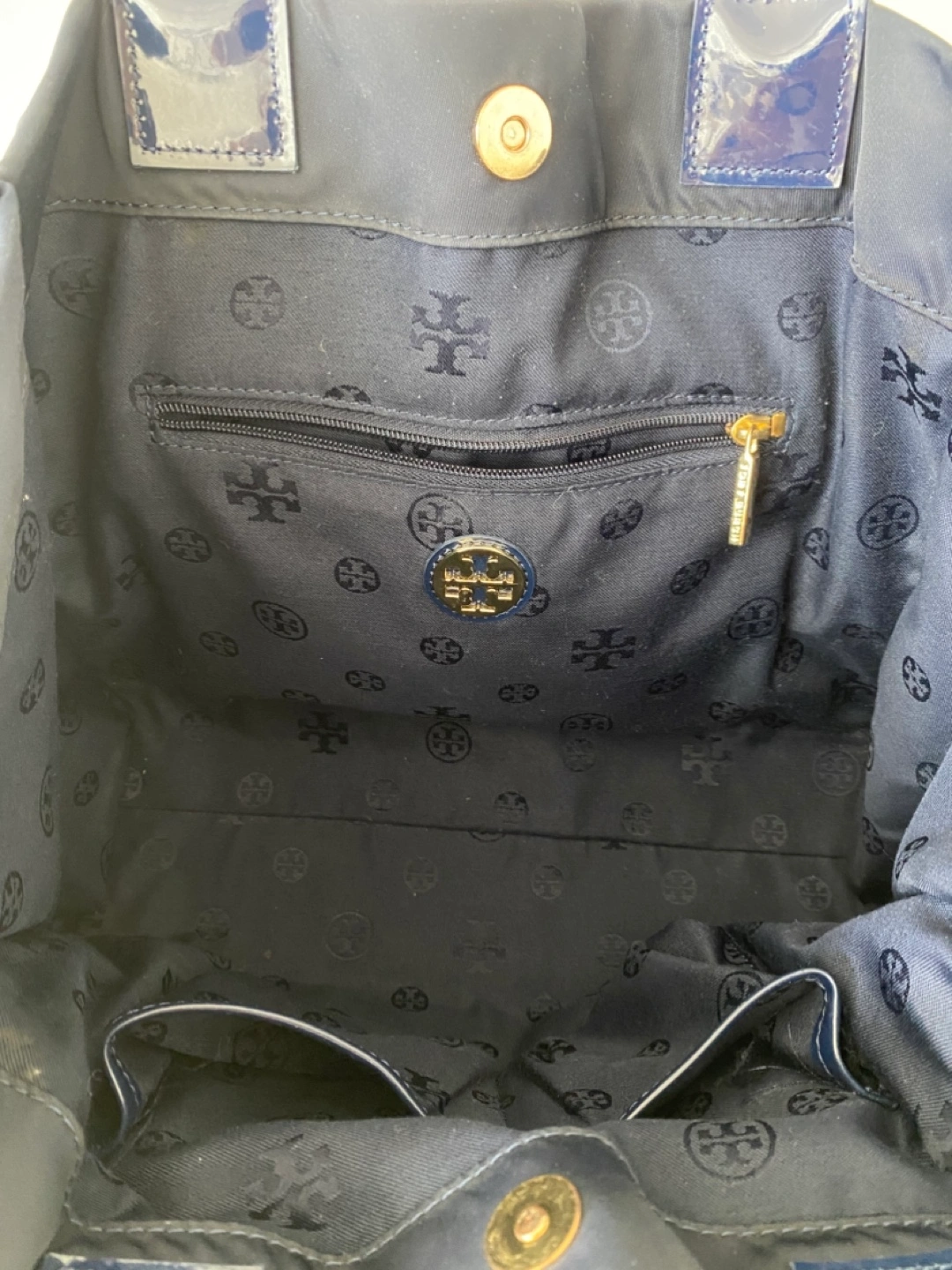 A stylish navy Tory Burch tote bag in great condition! It has a zipper pocket inside and the Tory Burch logo pattern throughout the interior lining. Perfect for everyday use or as a work bag