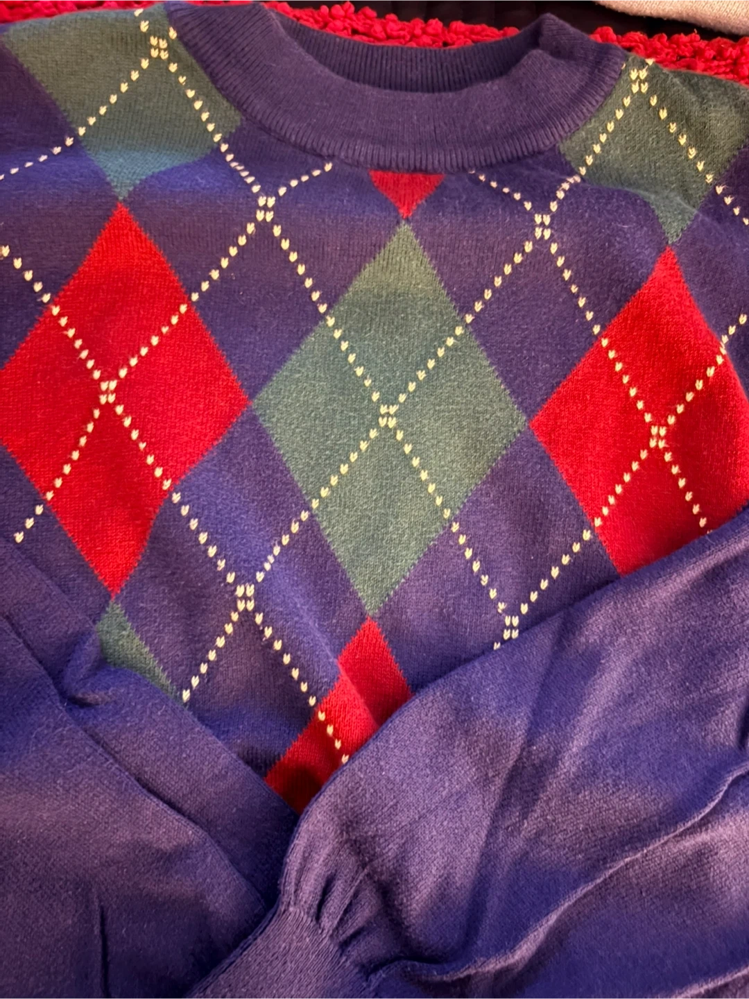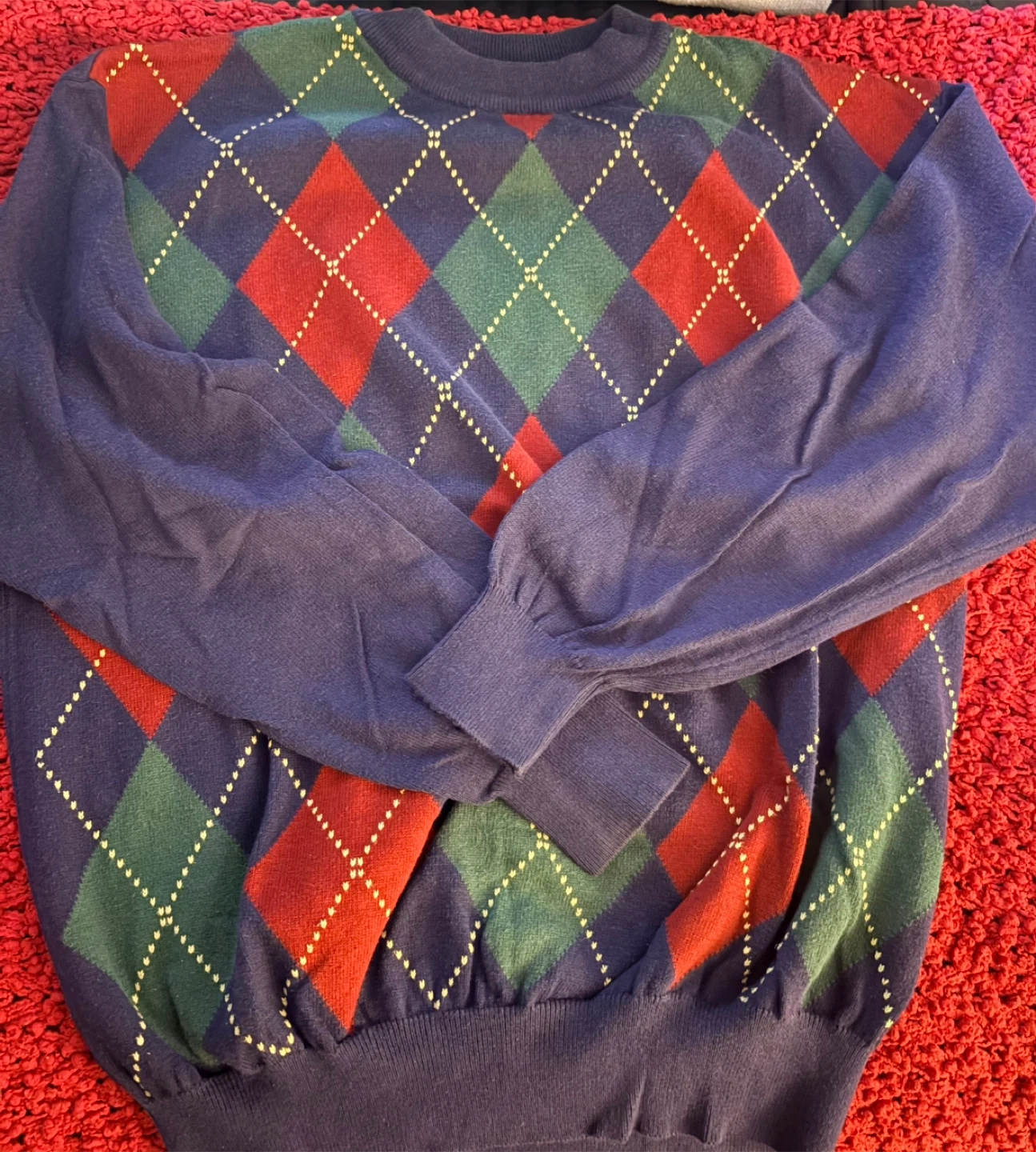 Selling a United Colors of Benetton sweater with an argyle pattern. It's made of 100% cotton and is a lovely addition to any wardrobe!