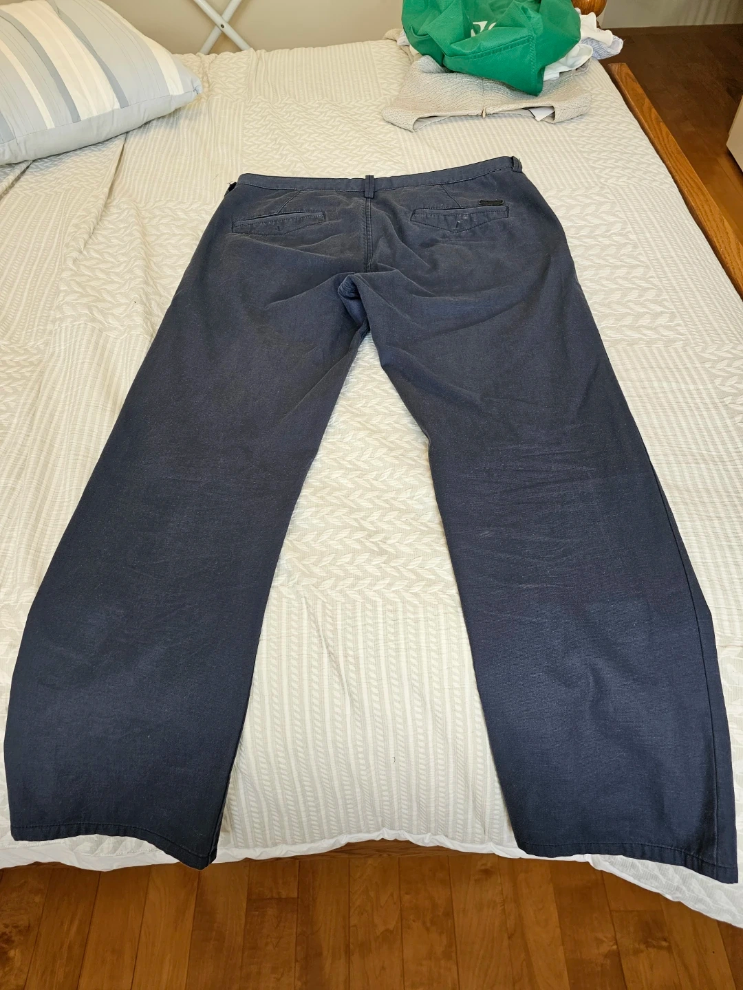 Dark blue dress pants from Hugo Boss. They're a flat front style with a button and zipper closure. Includes belt loops for easy accessorizing. Great for a sharp, professional look!