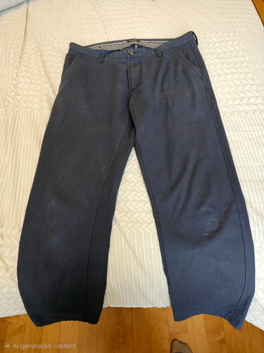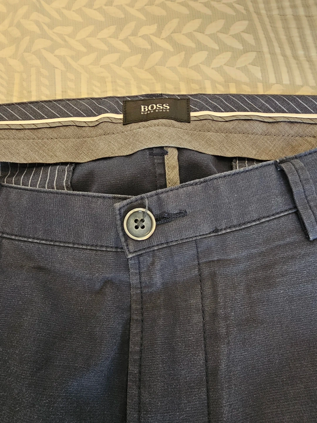 Dark blue dress pants from Hugo Boss. They're a flat front style with a button and zipper closure. Includes belt loops for easy accessorizing. Great for a sharp, professional look!