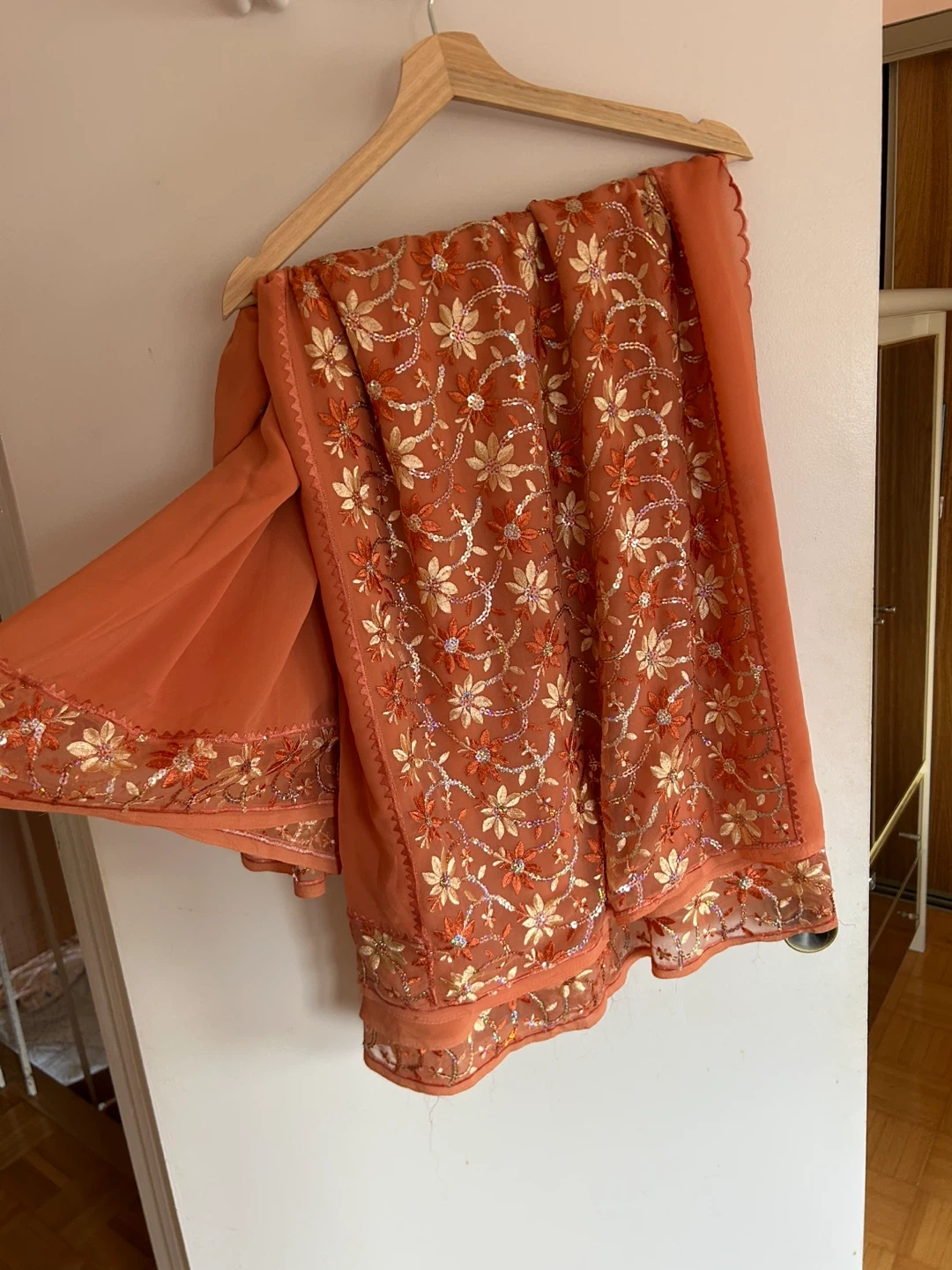 Beautiful peachy orange saree featuring intricate floral embroidery with sequins and a fully decorated border. The fabric is lightweight and drapes well. Perfect for special occasions and celebrations!