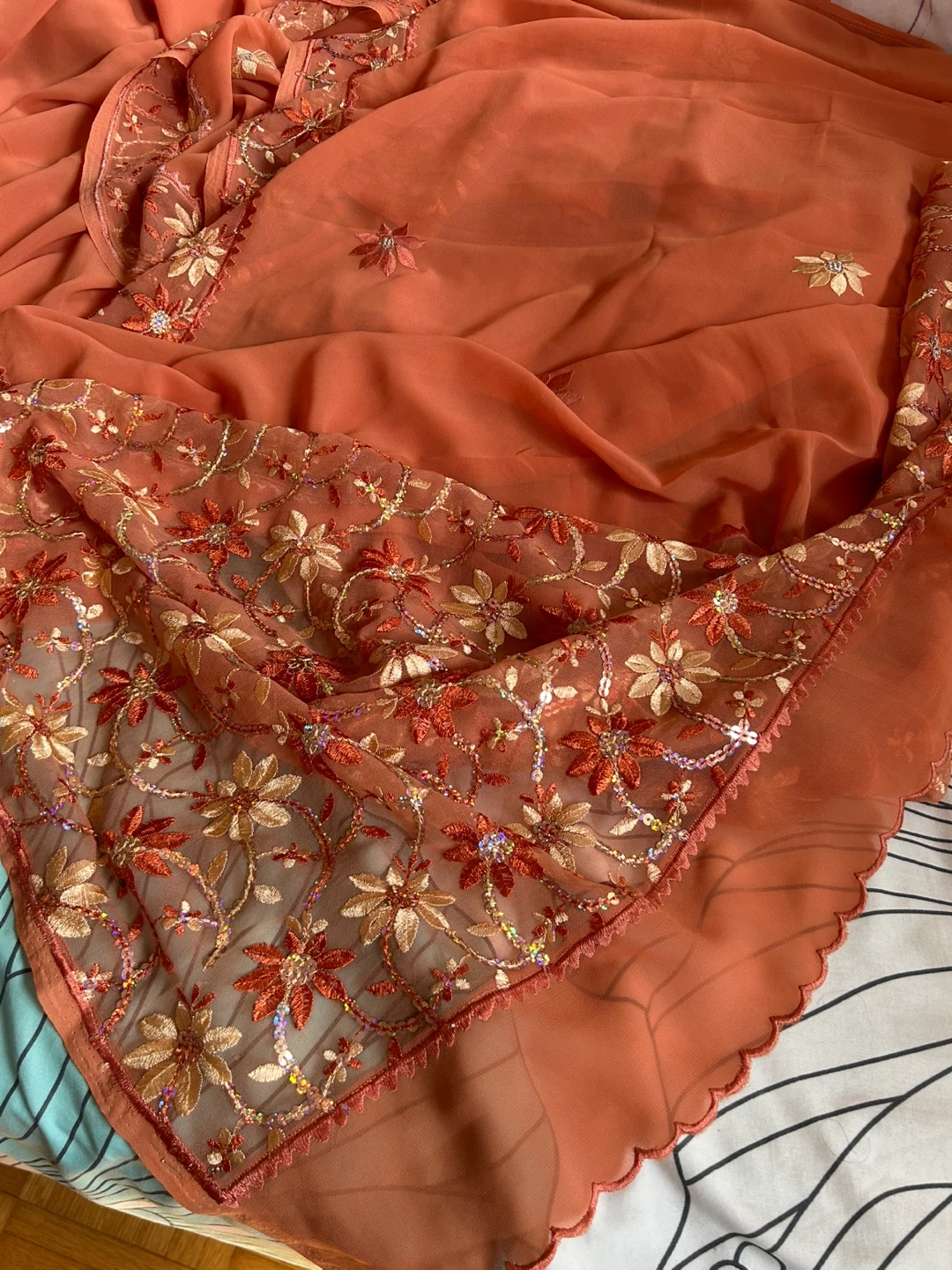 Beautiful peachy orange saree featuring intricate floral embroidery with sequins and a fully decorated border. The fabric is lightweight and drapes well. Perfect for special occasions and celebrations!